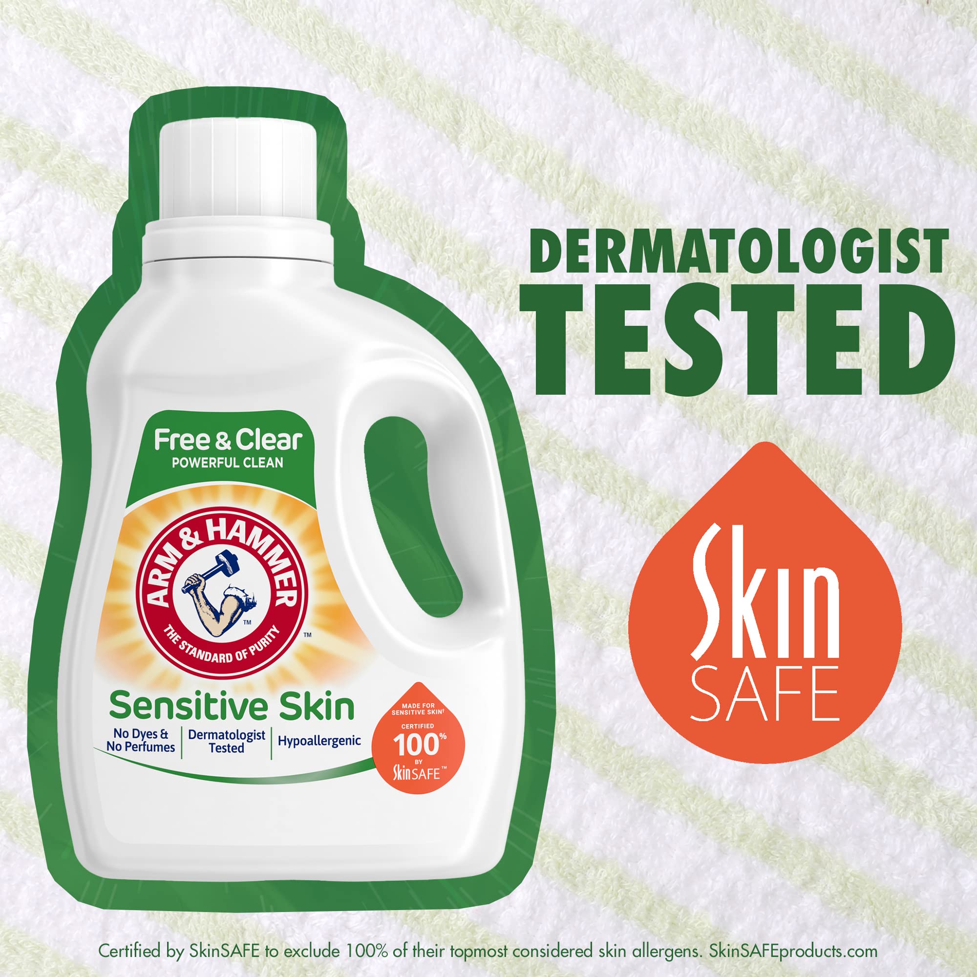 POWERFUL CLEAN THAT'S GENTLE ON SKIN. As a sensitive skin liquid laundry detergent with no dyes and no perfumes, ARM & HAMMER Sensitive Free & Clear is still tough on odors, dirt, and stains. This free & gentle laundry liquid gives you a fresh clean you can count on without dyes and fragrances that impact people with sensitive skin who need a hypoallergenic washing detergent