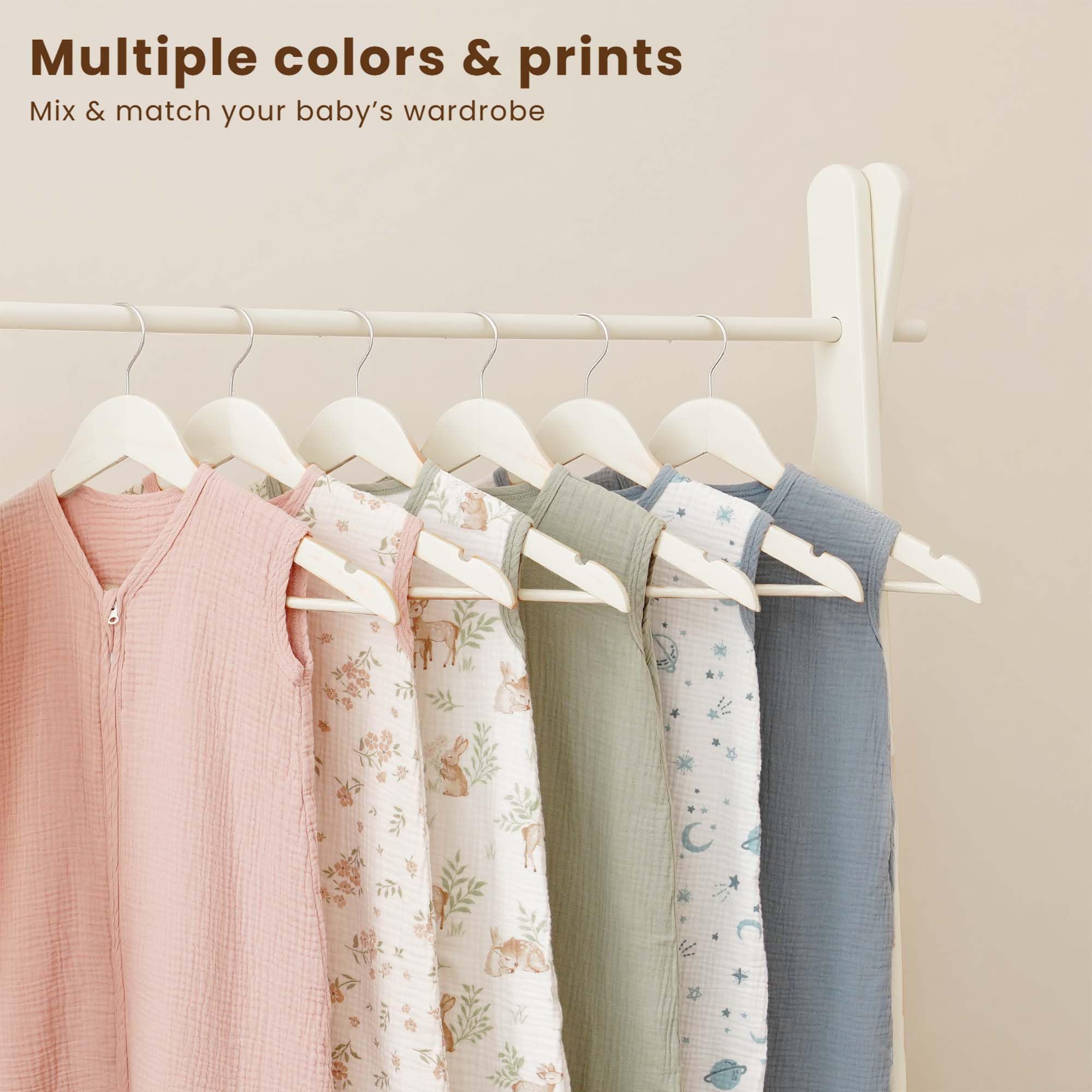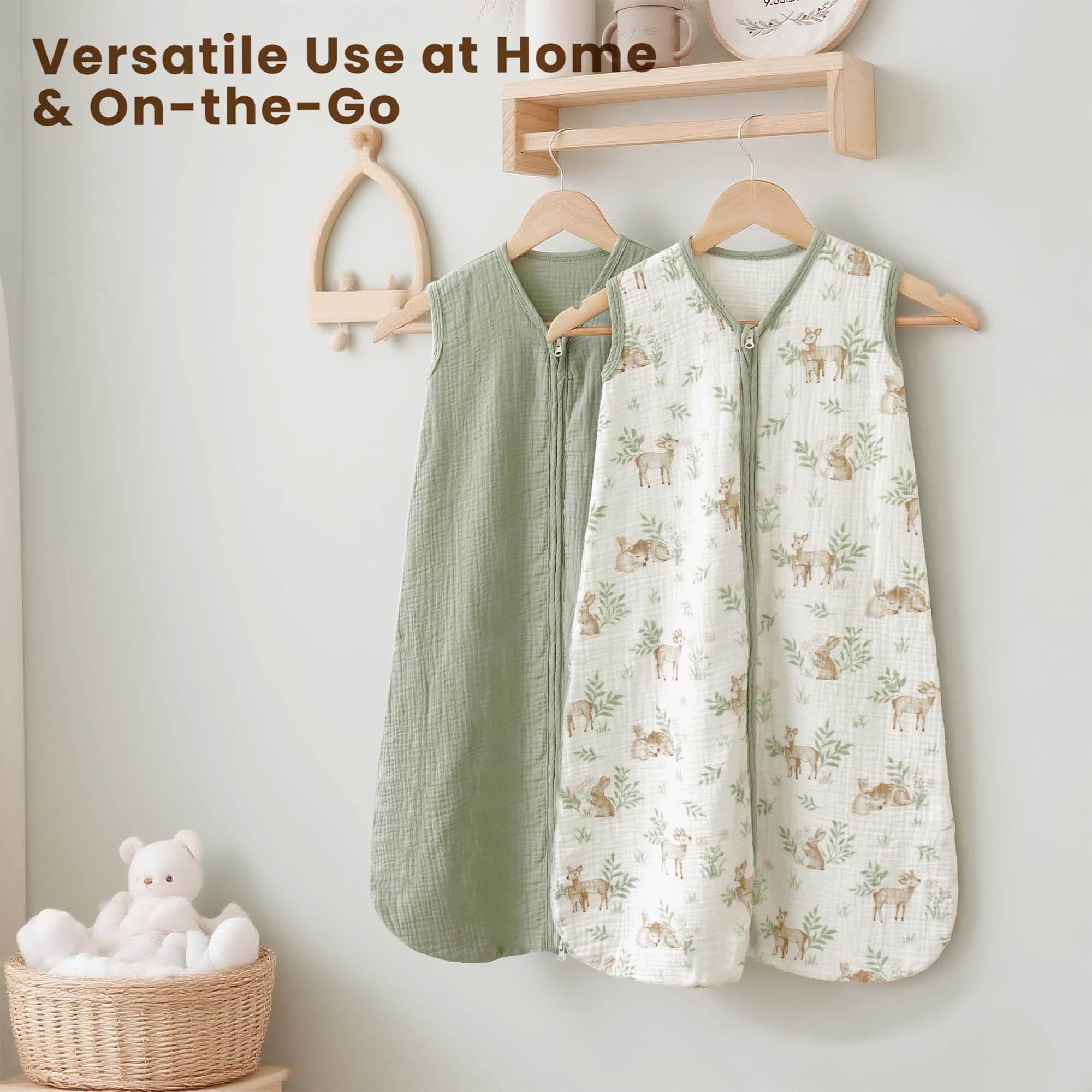 Double-Layer Muslin for Breathable Comfort: Crafted from OEKO-TEX certified muslin cotton with a soft double-layer design, this wearable blanket offers gentle warmth and breathability—perfect for naps and bedtime in warmer rooms or transitional seasons. Each set includes 2 sleep sacks—one in a solid color and one with a delicate print—blending comfort and style for everyday rotation in your nursery