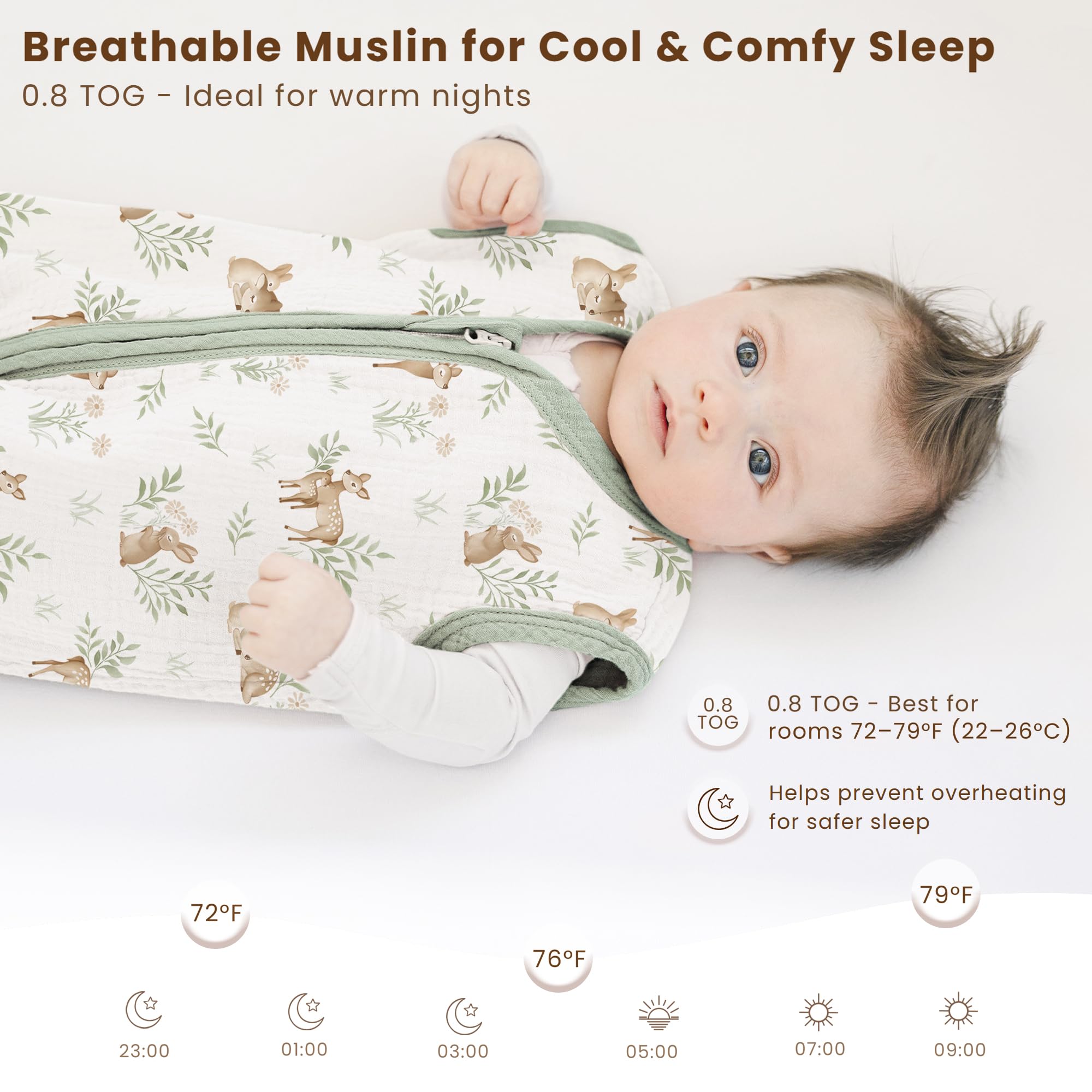 0.8 TOG for Gentle Temperature Regulation: Designed with a 0.8 TOG rating, this muslin sleep sack provides just the right amount of lightweight warmth for babies who tend to run warm. It helps maintain a steady, cozy temperature without overheating—perfect for spring, summer, and air-conditioned rooms