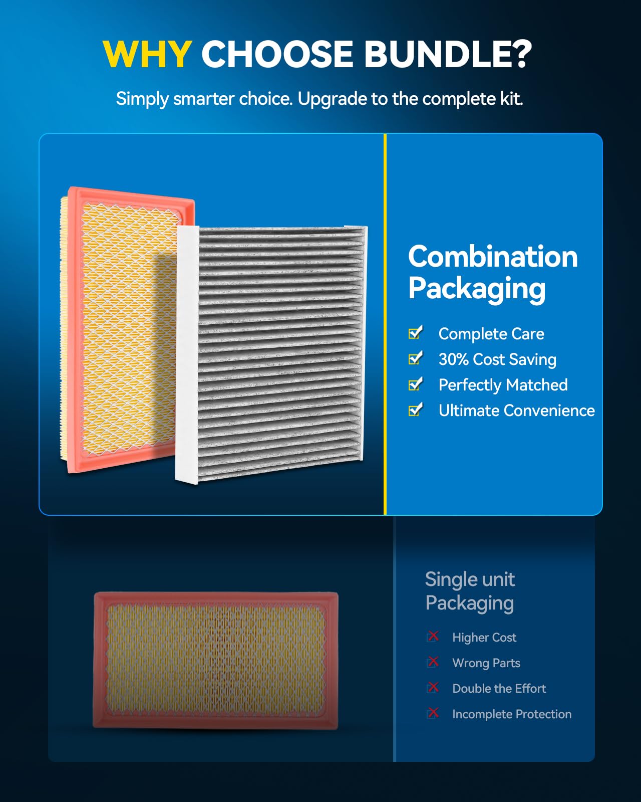 [Ultimate Convenience Bundle]: Skip the hassle of separate purchases! Our curated 2-in-1 kit matches the exact engine & cabin air filters your vehicle needs. Simply enter your make, model, and year for a perfect fit. One click, one box, one-stop shopping that saves you both time and money