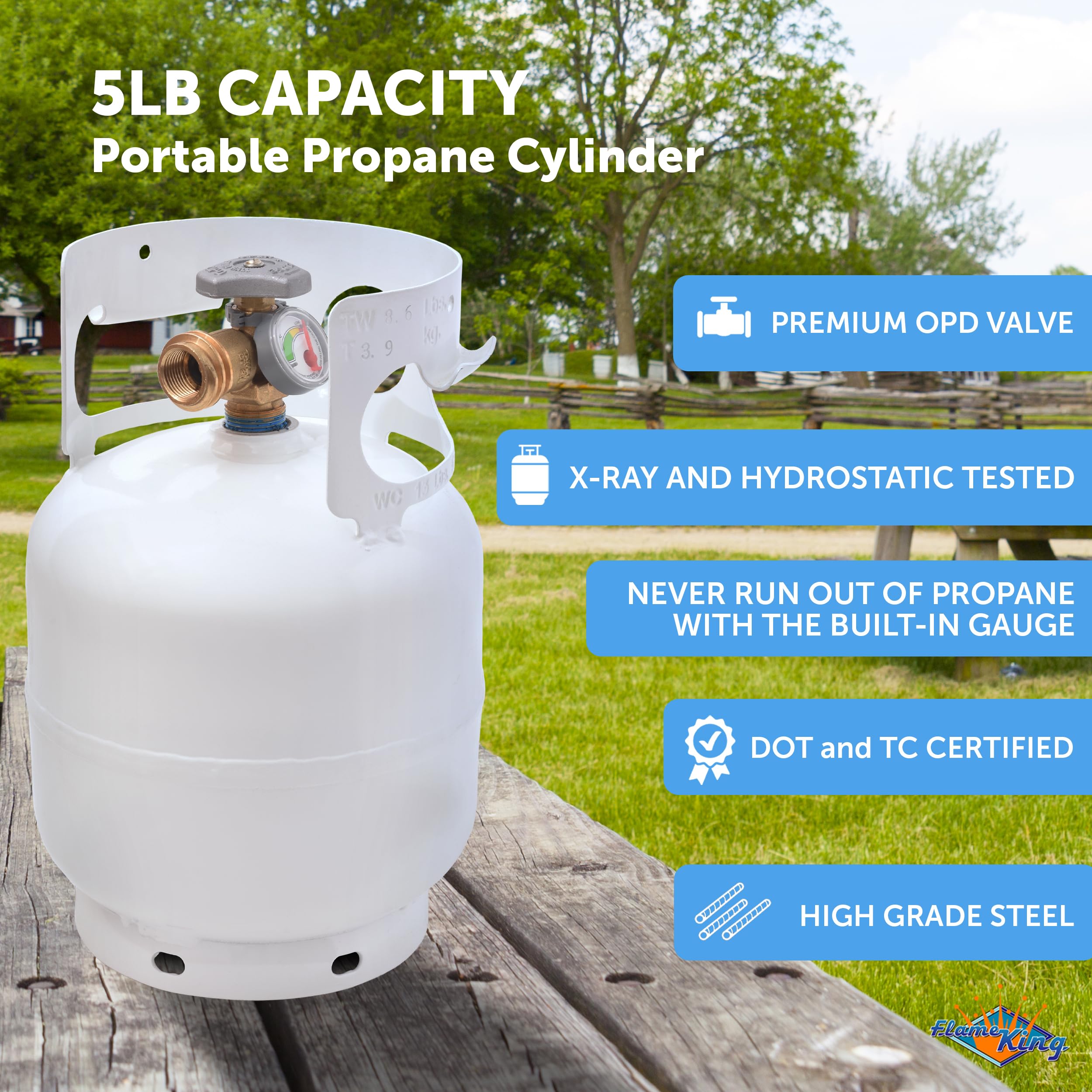 PORTABLE with easy to hold collar makes it a perfect buddy for camping, ice fishing, and other outdoor activities. Use this tank along with Flame King’s Propane Backpacks for easier transport. Check item numbers YSNBKPK-AF and YSNBKPK.