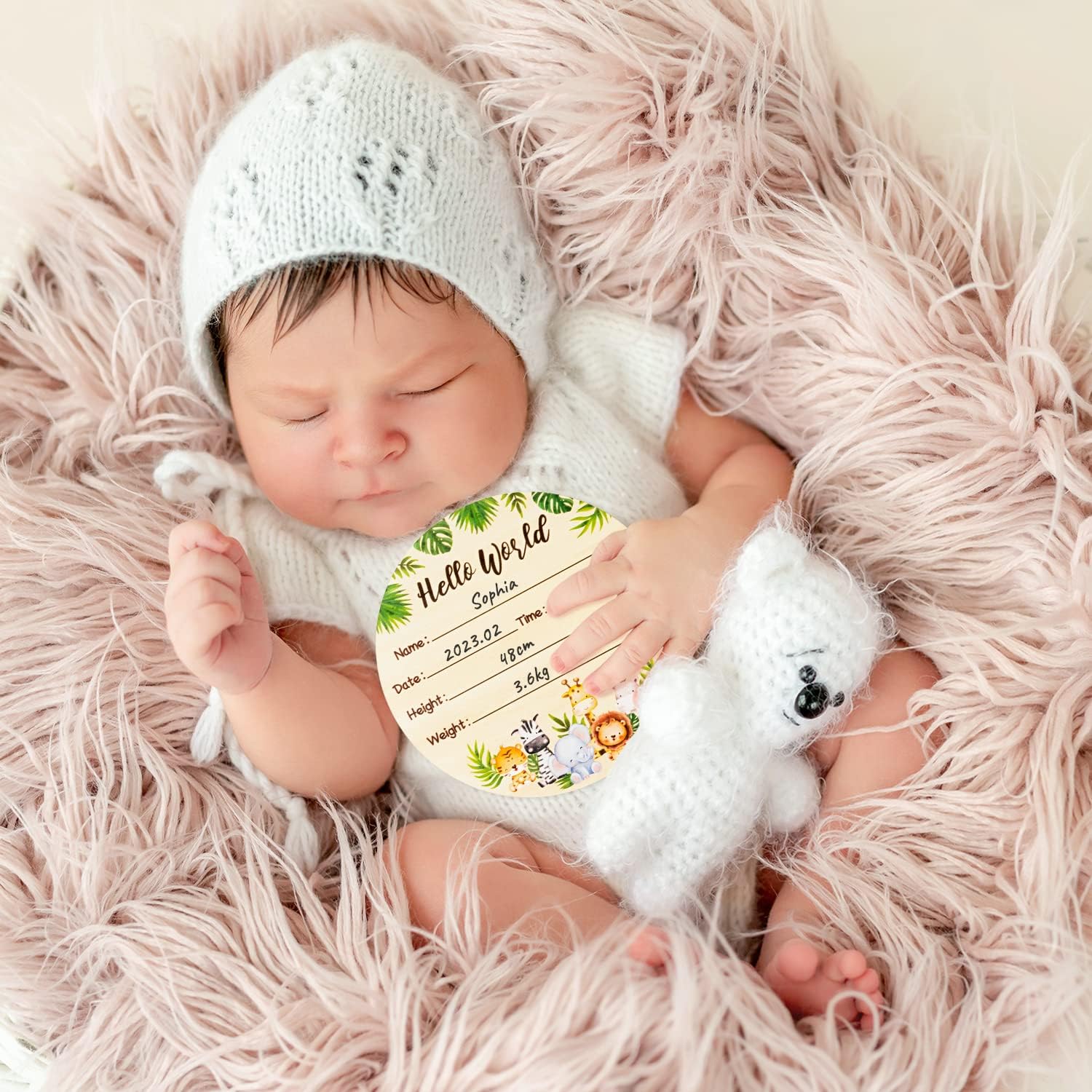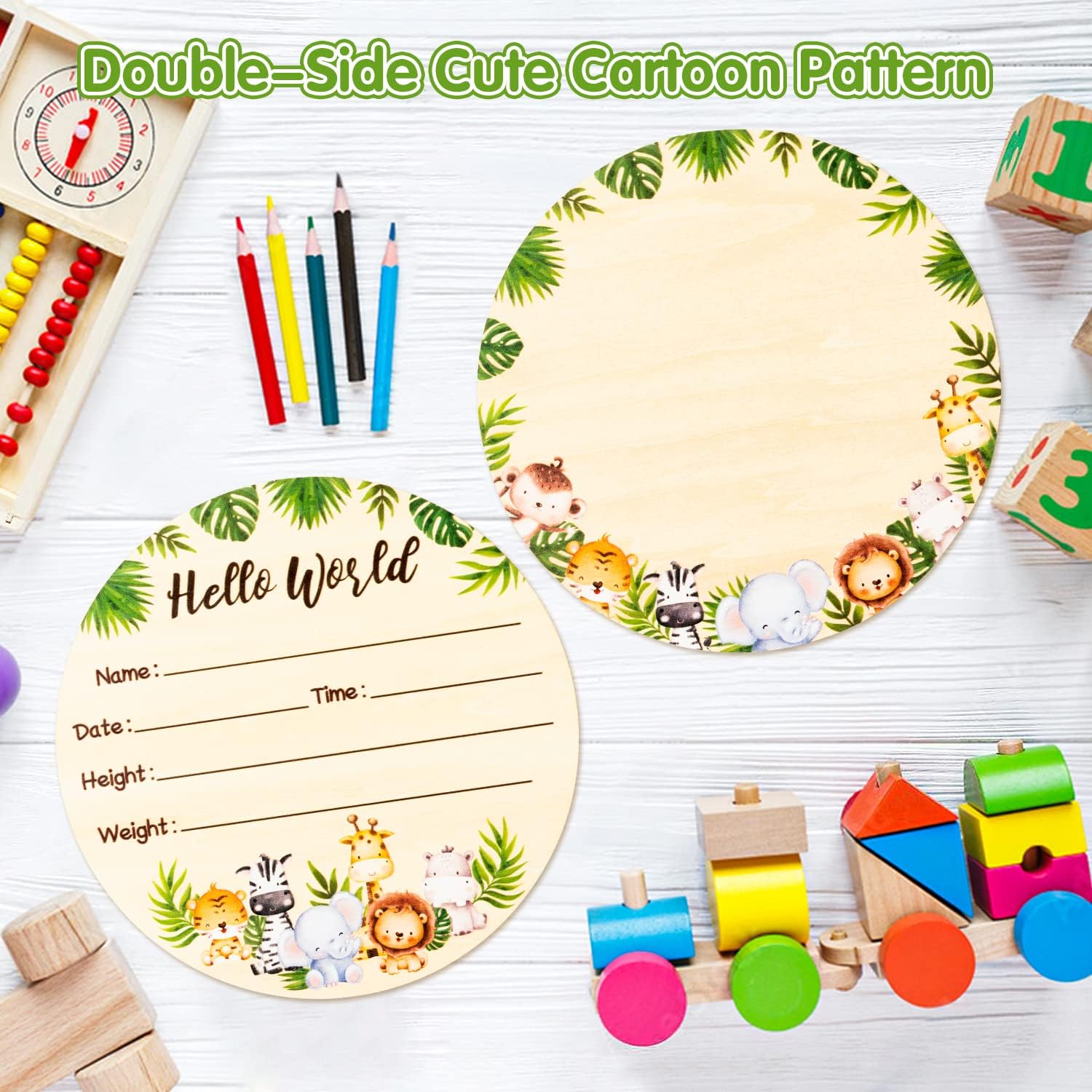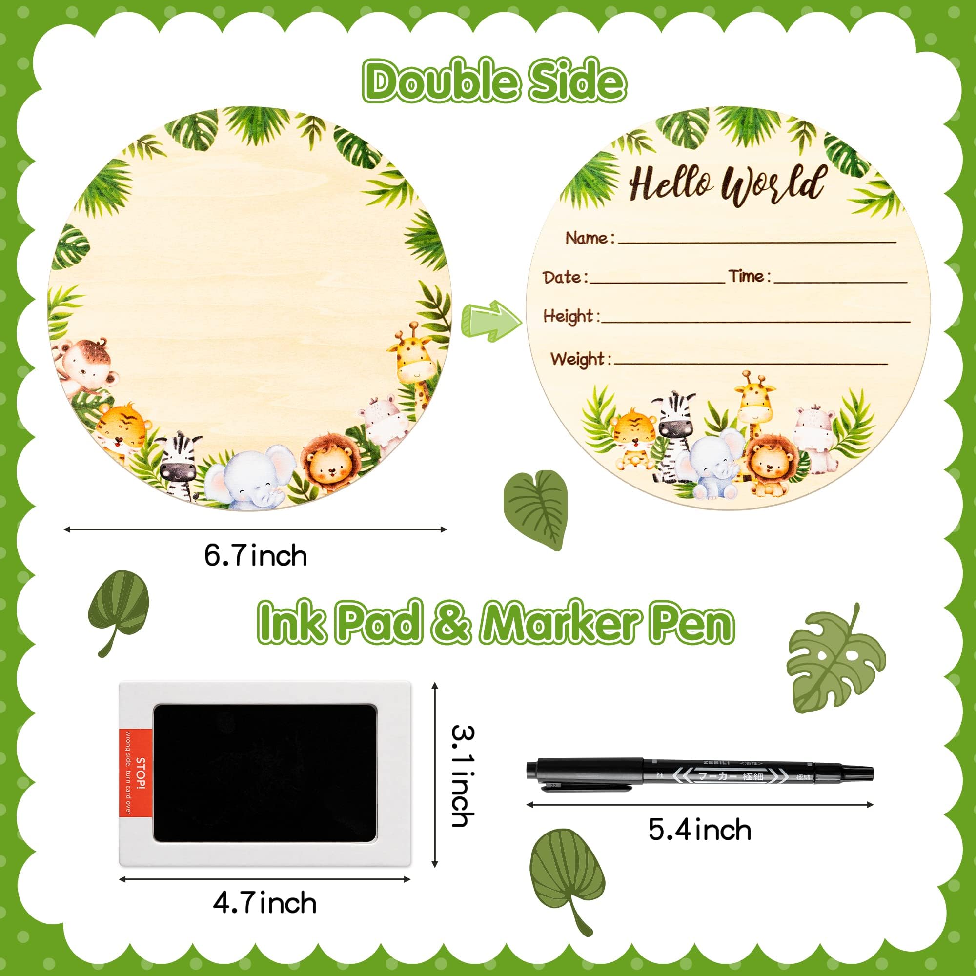 CUTE DESIGN: Made of premium hardwood, the wooden sign will not peel off wood chips after being sanded and polished. The cute and exquisite safari animal print design on it transforms a simple wooden sign into an exquisite birth memento.