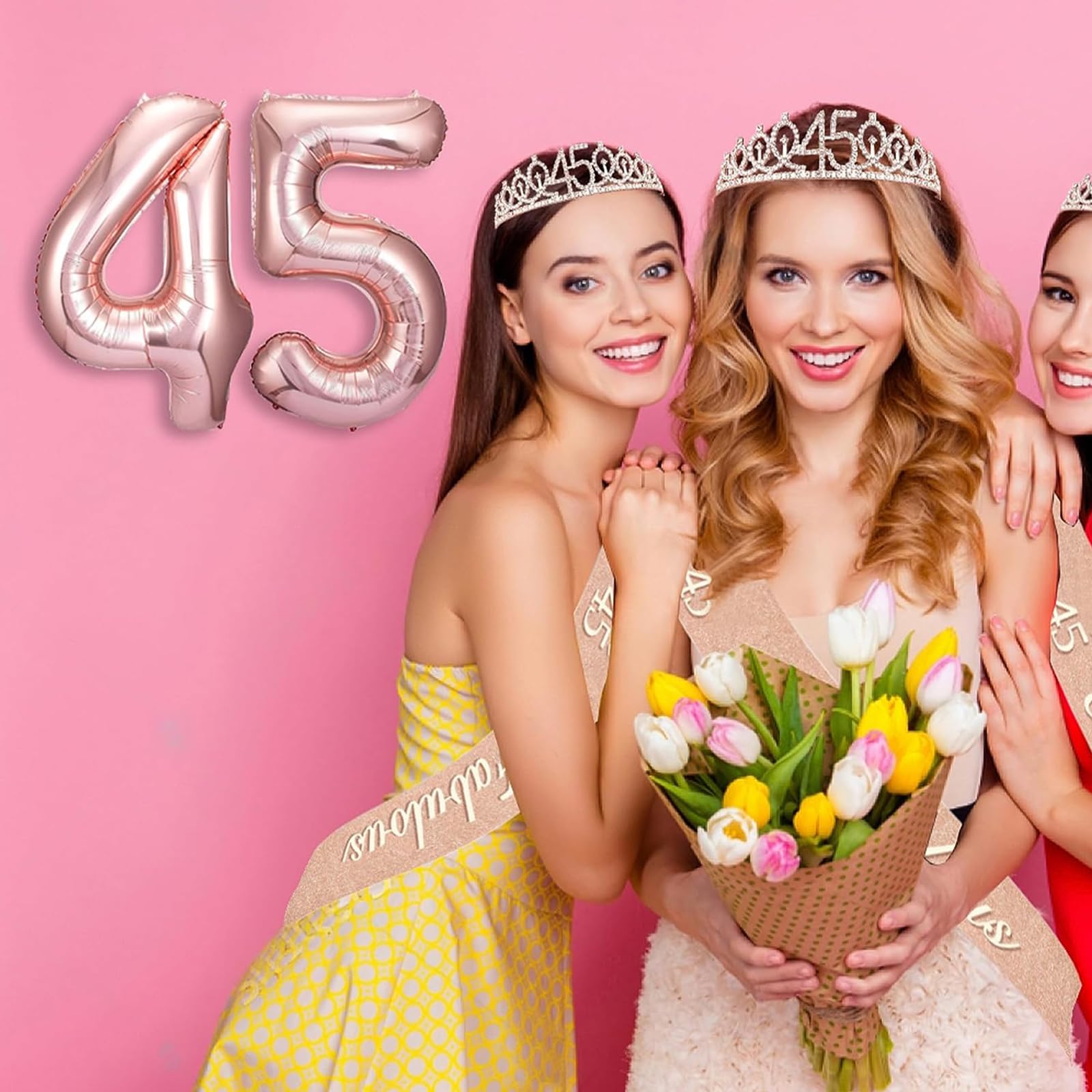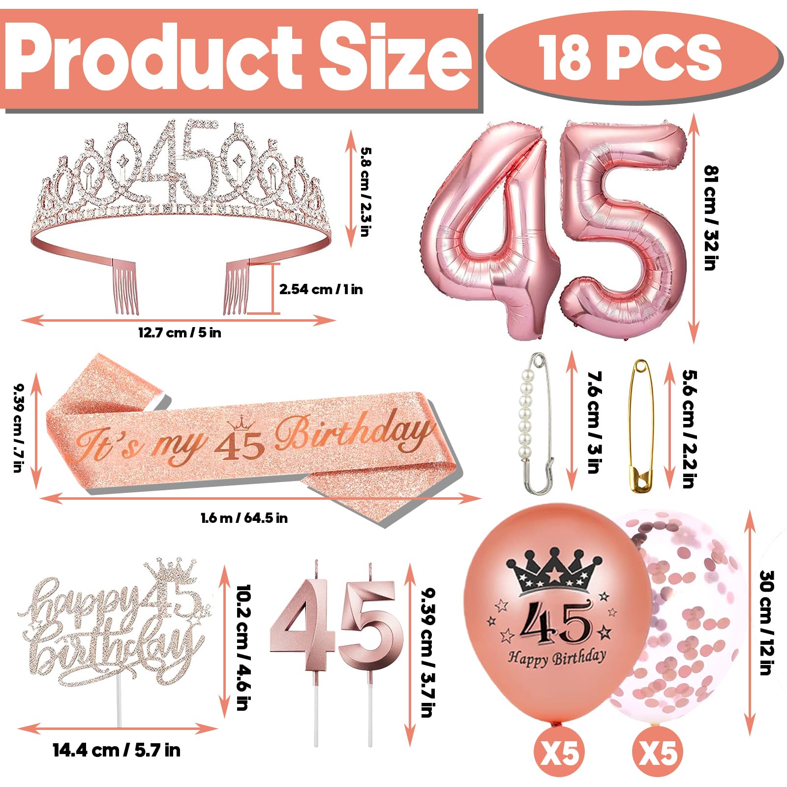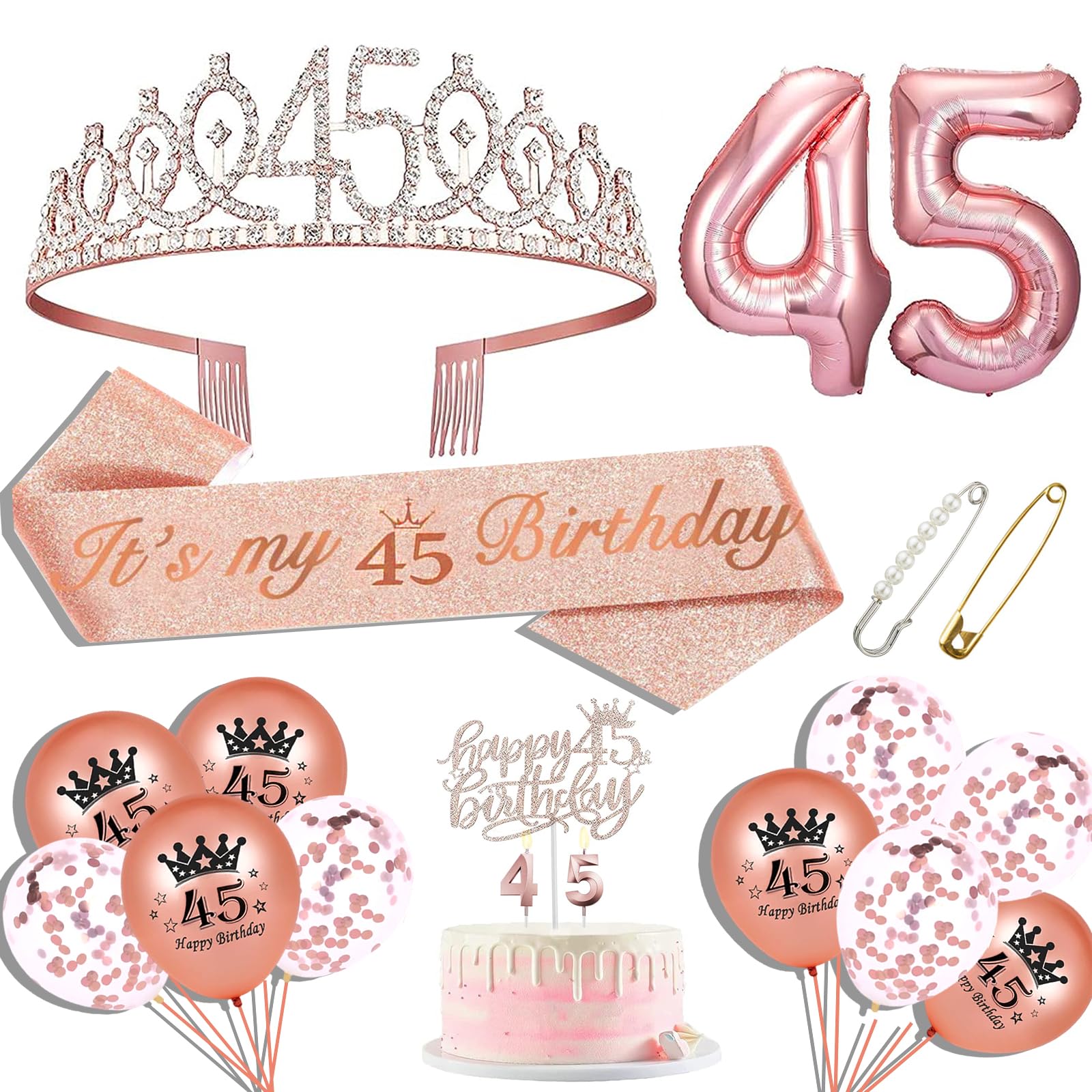 【45th Birthday Decorations】: Package coming with rose gold 45 birthday crown 1pc, 45 birthday sash 1pc, 45th birthday balloons 12pcs, happy 45th birthday cake topper 1pc, 45th birthday candles, This Birthday Gifts for women remind her and everyone in the 45th birthday party how fabulous she is.