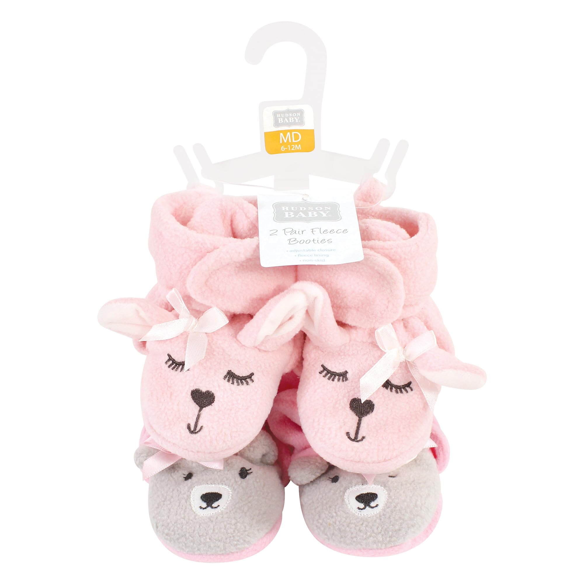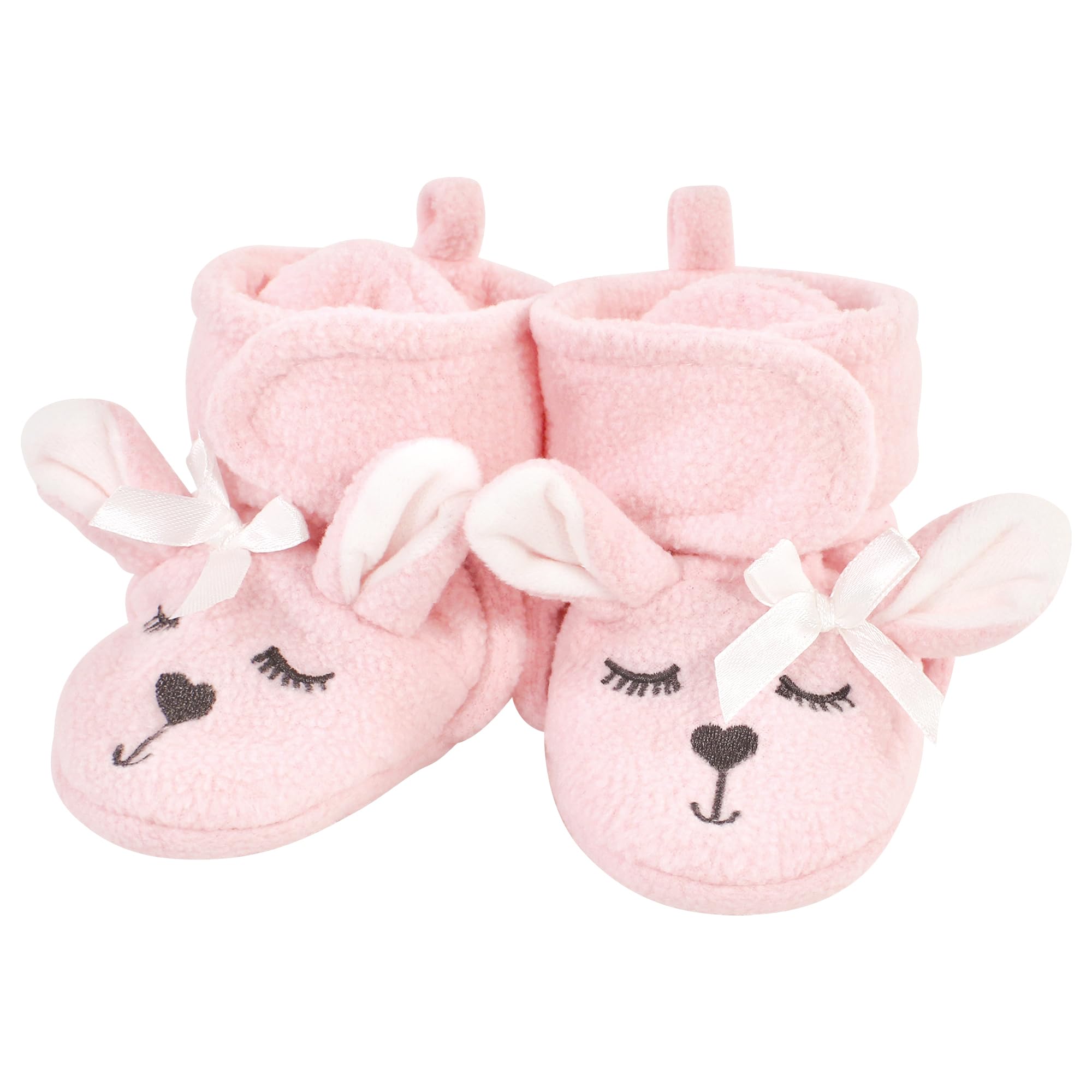 Description Hudson Baby fleece booties are comfortable, cozy baby booties made with fleece material that will keep your little one's feet warm and comfortable. Our booties wrap around your baby's foot and fasten in the front with a velcro closure, so they are easy to put on, fasten and stay on. Our fleece booties feature non-skid soles to prevent your baby from slipping and falling when they start to walk and run.