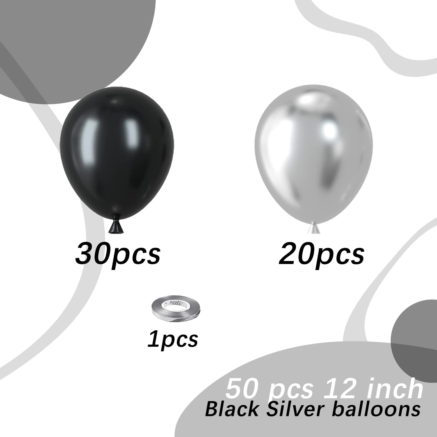 【What You will Get】: The main color of party balloons is black silver. The black and silver balloons sets come with 30pcs black balloons, 20pcs silver balloons and one Ribbons(33 feet). black and silver birthday decorations are all 12 inches, and the uniform size can provide consistency for your party equipment.