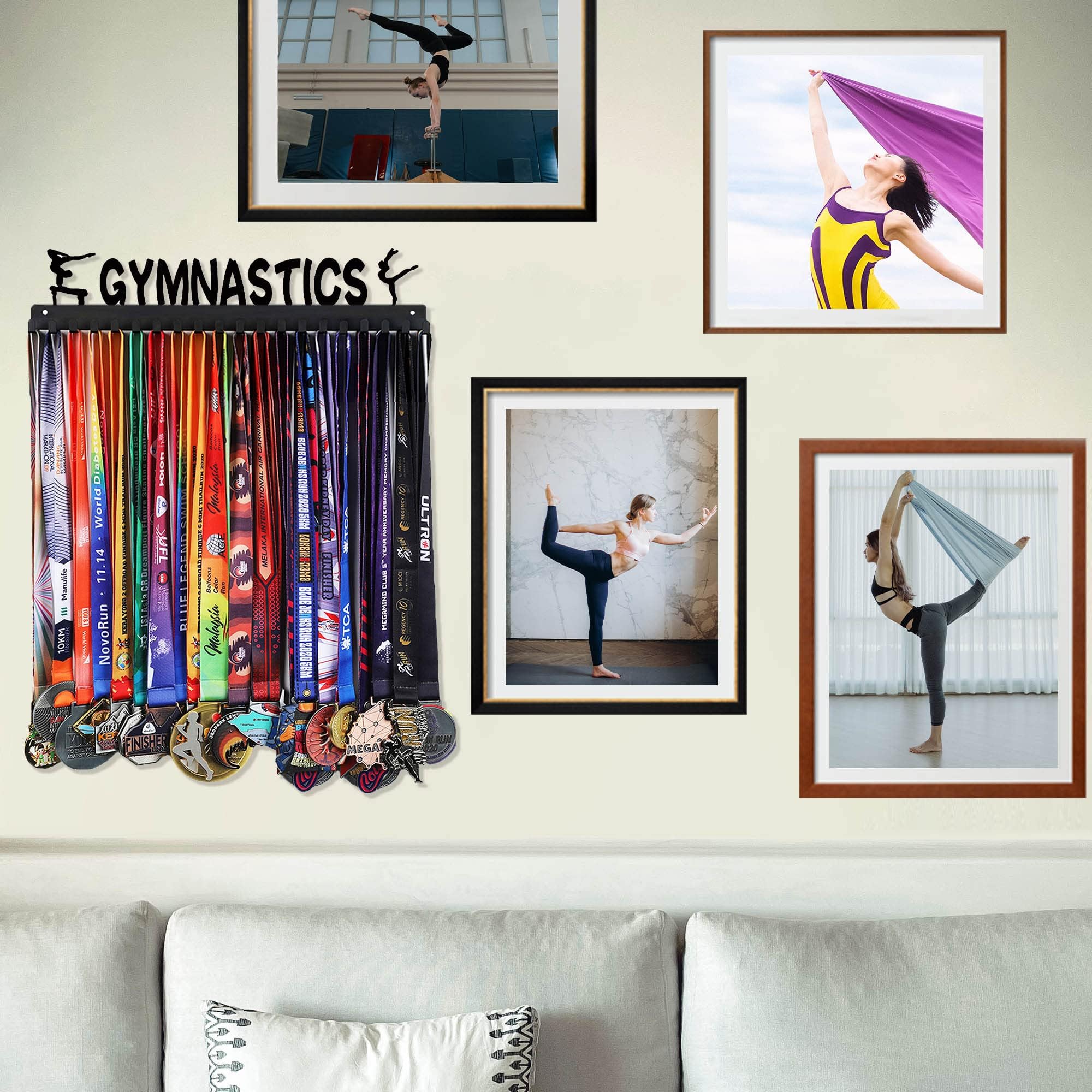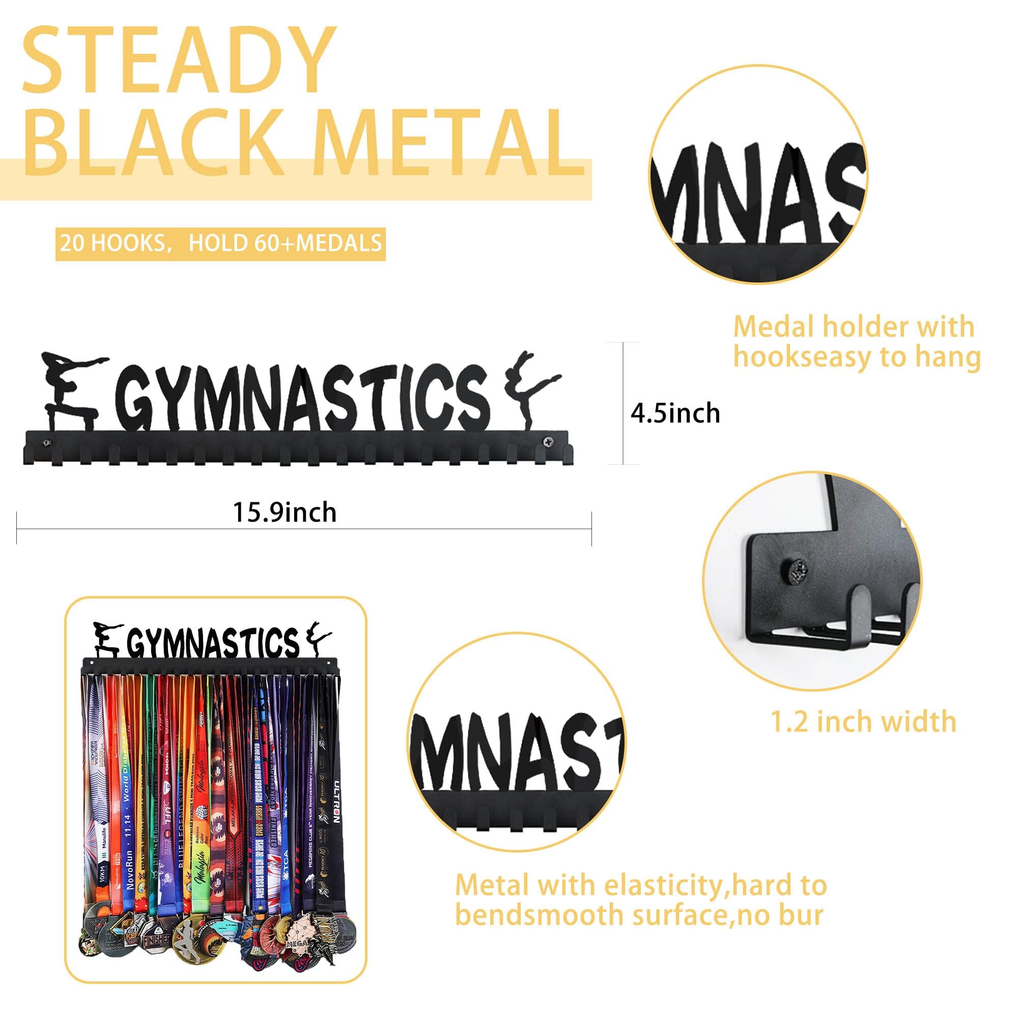 【GREAT GIFTS IDEA】 Goutoports medal hanger is the perfect choice for athletes and sports enthusiasts who want to display their gymnastics, soccer, dance, triathlon, wrestling, karate, hockey, volleyball, baseball, or jiu jitsu medals. The 20 hooks of the gymnastics medal hanger can accommodate medals, ribbons, and sports bands. It can be placed in various settings such as the living room, bedroom, gym room, or office. This versatile medal and trophy holder can proudly display your collection.