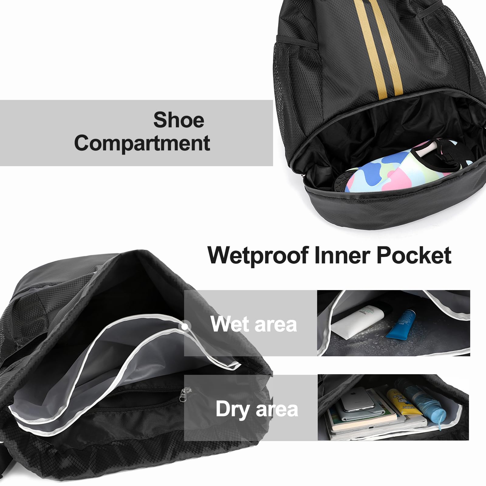 Large Capacity: The spacious space of this sports backpack ensures that you can carry training equipment, swim gear, beach items, all the essentials you need for workout. A basketball can be easily put in this bag without worrying about running out of space