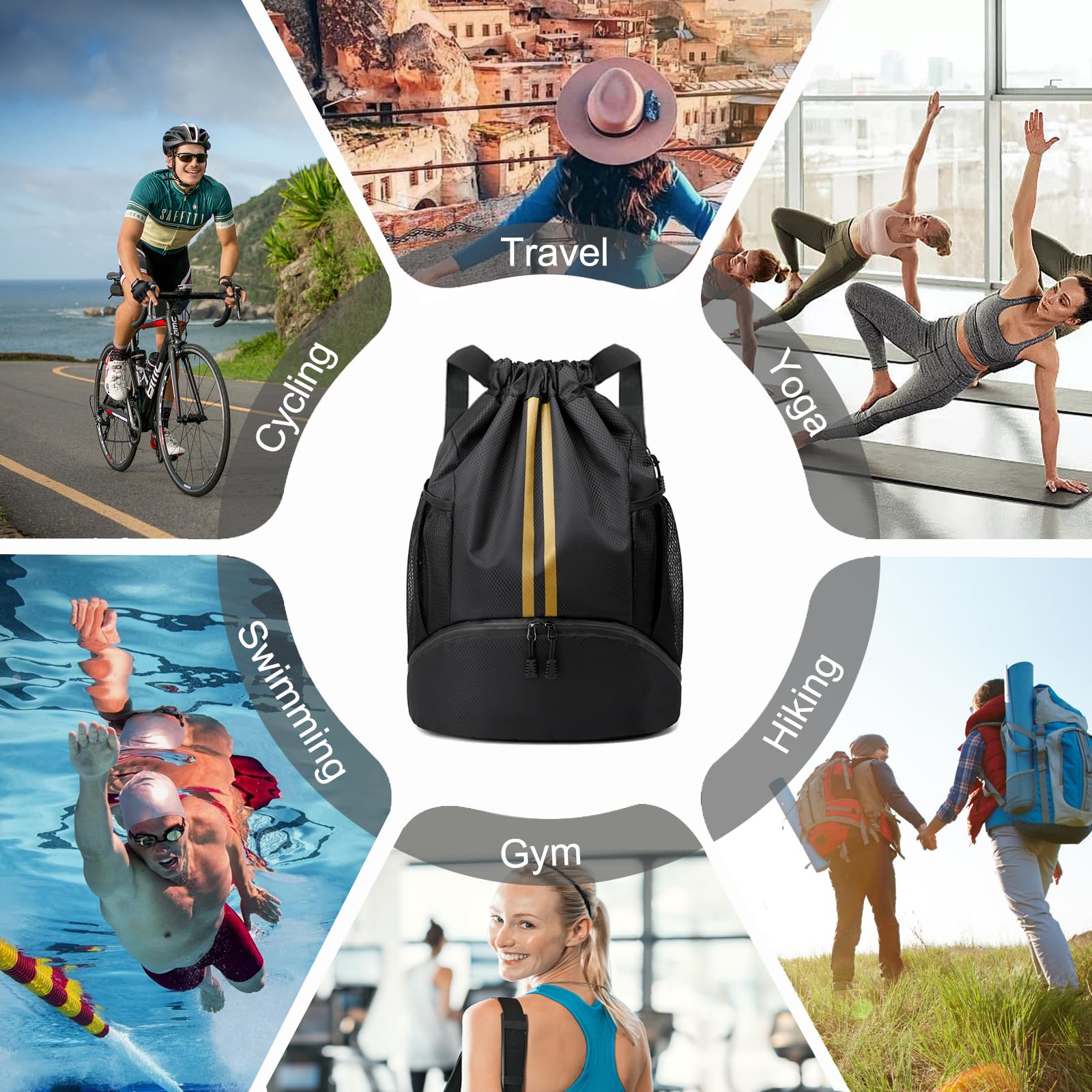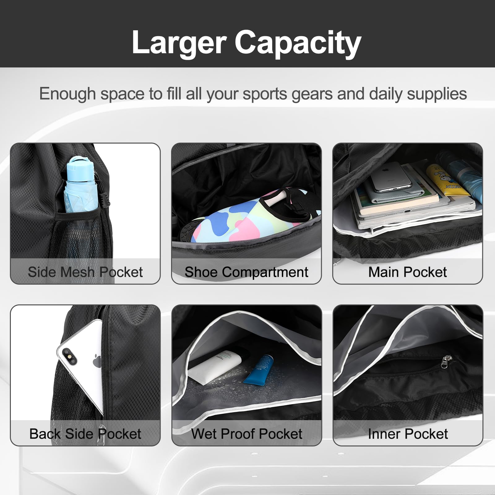 Dry/Wet Separation: Our gym bag is designed with multi-pocket. There have independent shoes compartment and wet proof inner pocket, which makes it convenient for gym-goers, swimmers, and anyone who needs to keep their gear separated and organized