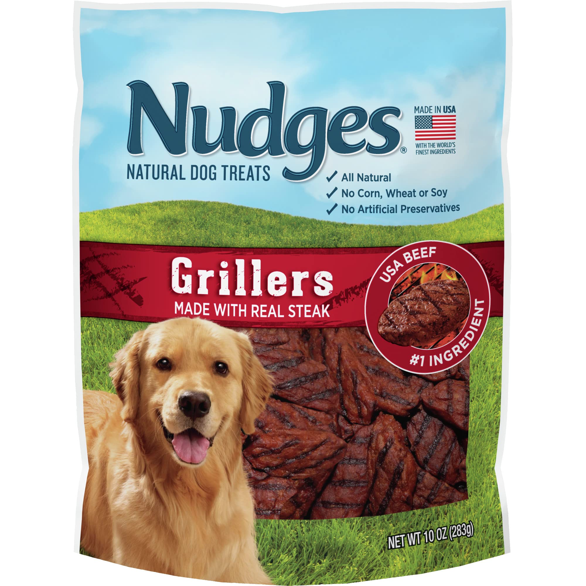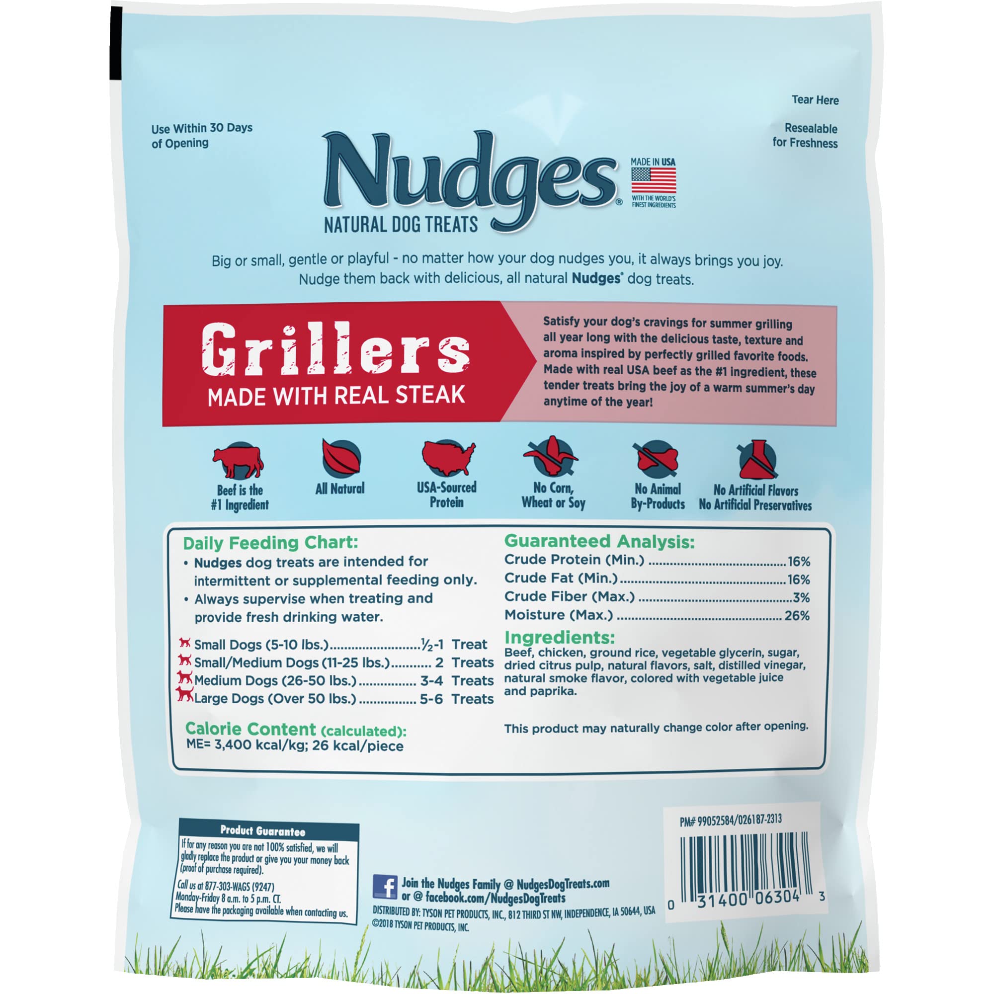 Treat your dog to summer grilling all year long with the delicious taste, texture and aroma of Nudges Natural Dog Treats Grillers Made with Real Steak. Inspired by perfectly grilled favorite foods and made with real USA sourced beef as the number one ingredient, these tender dog treats contain no artificial flavors or preservatives. With no corn, wheat, soy or animal by products, these all natural protein treats bring the joy of a warm summer day anytime of the year. Includes one 10 oz resealable package