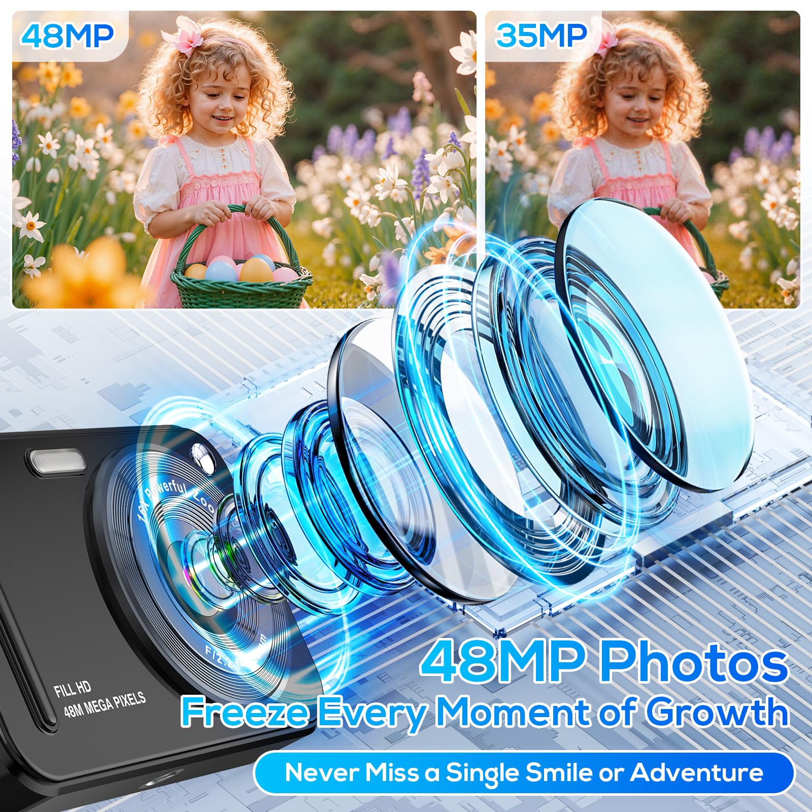 【Effortlessly Capture Stunning Photos and Videos】- Featuring a premium CMOS sensor and anti-shake technology, this digital camera delivers crisp 48MP images and smooth FHD 1080P videos. This point and shoot digital camera requires no complicated settings—just press the shutter and let the camera do the rest! With a 2.4-inch HD display, kids can instantly review their shots. Whether it's a birthday party, family trip, or school event, this small camera makes every moment unforgettable