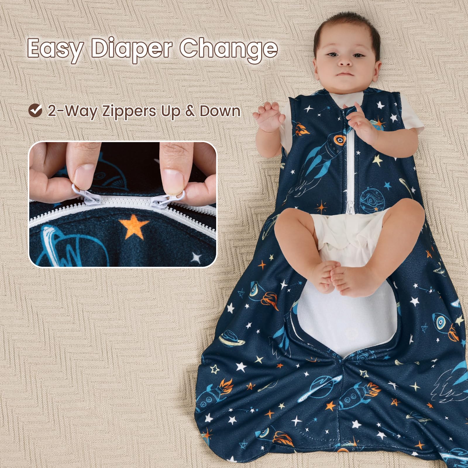 Generous Bottom Space and 2-way Zipper: Our sleeping bags have generous bottom space that allows your baby to kick and move their legs freely. The 2-way zipper makes it easy for you to change your baby's diaper. Our sleep sacks come with protective layers that prevent the zipper from accidentally scratching your baby. The sleeveless design allows free movement of your baby's arms, making it easier for them to roll over and sleep comfortably.