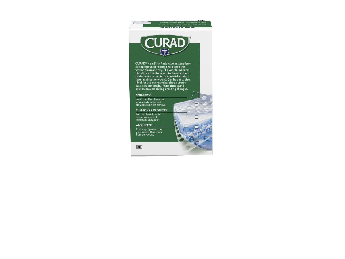 CURAD Non-Stick Pads – 20 CT offer absorbent protection for common types of wounds and won’t cause further injury when removed. A cotton/polyester blend prevents these non-stick Pads from clinging to healing surgical sites, cuts, burns, scrapes, and abrasions. Their ventilated outer film makes them an ideal solution for wicking fluid away from skin and minimizing discomfort when changing dressings.