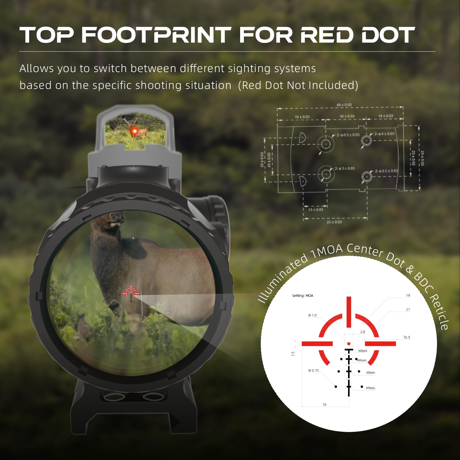 【Illuminated 1MOA Center Dot & BDC Reticle】: 10-level illuminated 1MOA center dot with bullet drop compensation markings for .223 5.56x45mm, optimized for quick shooting. Low-intensity settings are compatible with night vision, and the FMC coating ensures clear aiming, even without a battery