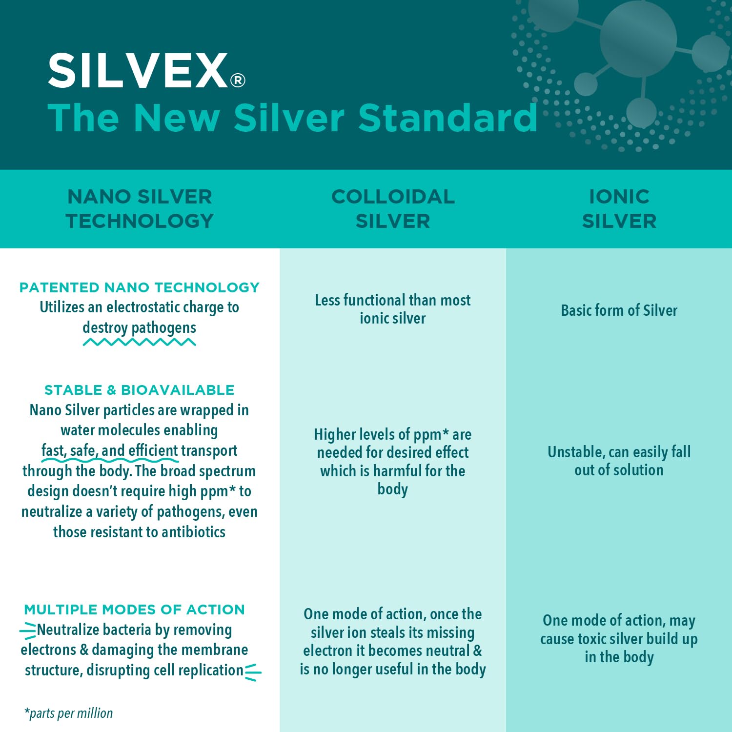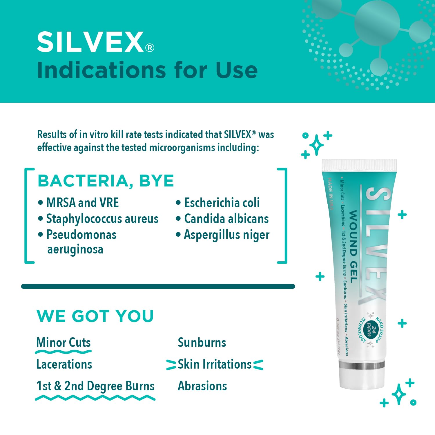Be Smart Get Preparedβs Silvex, a water-based hydrogel dressing using 24 PPM of Nano Silver Technology for moist wound care management. THE NEW SILVER STANDARD No need for a prescription! Anyone can use this easy-to-apply wound dressing hydrogel. Because itβs alcohol and petroleum-free, it doesnβt dry the skin and wound. Non-toxic and safe for everyone in the family. Over the years, silver ions were isolated using electrodes, direct current, and water. These silver solutions are very effective but unstable and require high PPM (parts per million) and aggregate (bind) in the body. Not anymore; the revolutionary Nano Technology is wrapped in water molecules enabling fast and efficient transport through the body. It disrupts cell replication, and independent studies have shown it to be more powerful than other forms of silver products.