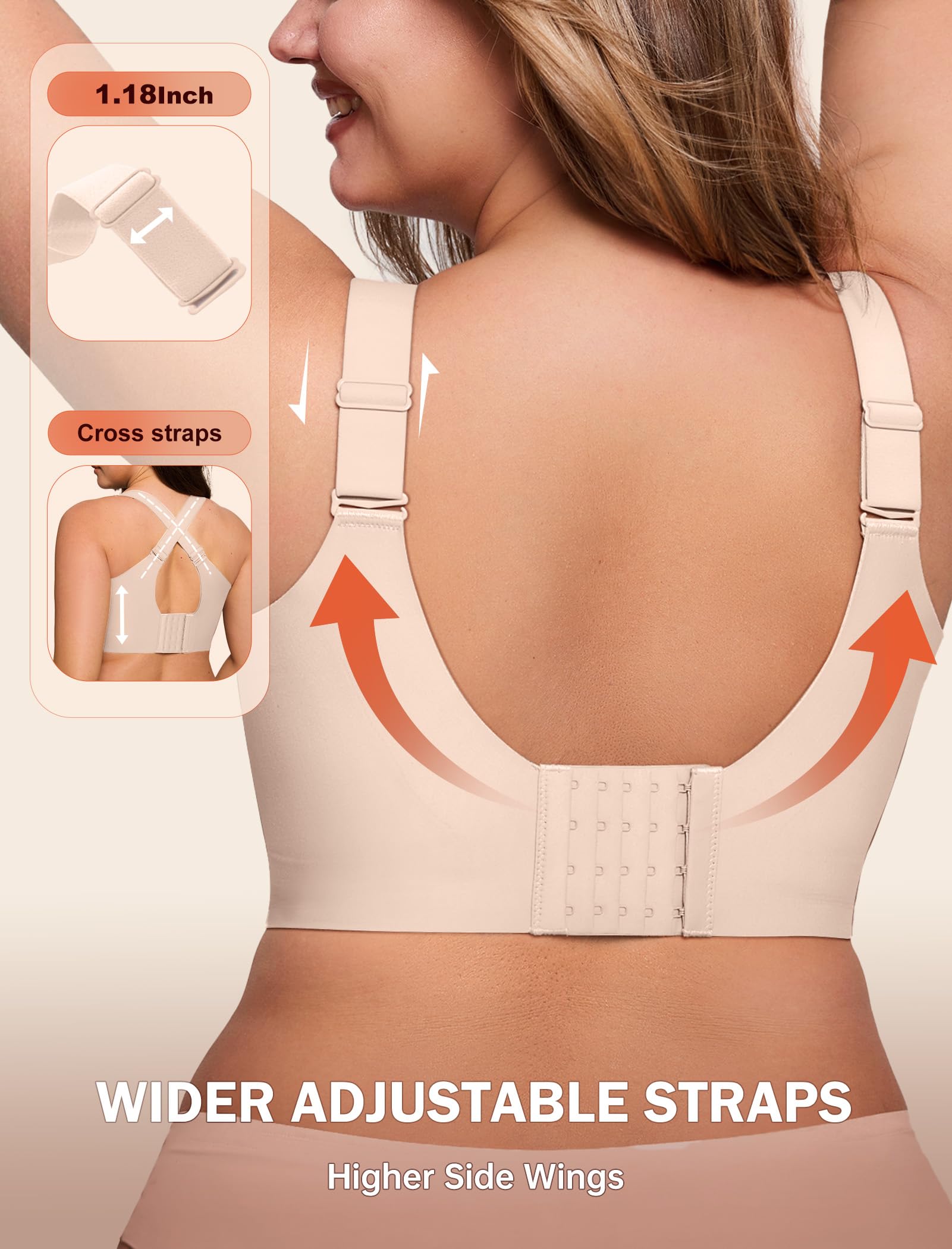 【Back Smoothing Bras & Wider Hooks】The back features precision glue-point technology for superior comfort, with a contoured wave-shaped inner layer that hugs your curves flawlessly. This sleek design not only enhances aesthetics but also smooths and conceals back bulges for a perfectly streamlined silhouette. The bras for women no underwire features 5 rows of 4 buckles and a free extender for a customizable fit.