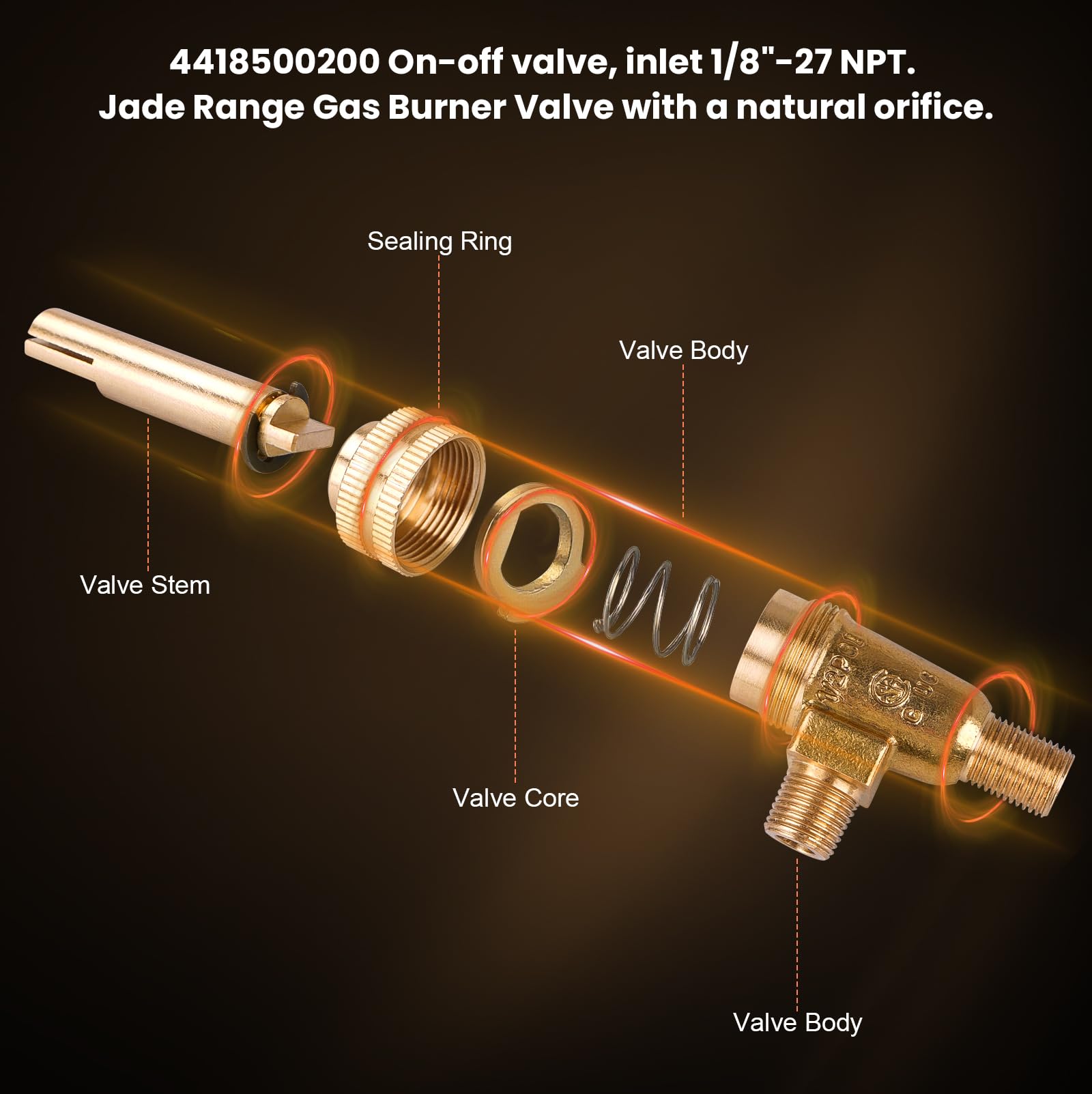 4418500200 On-off valve, inlet 1/8"-27 NPT. Jade Range Gas Burner Valve with a natural orifice.