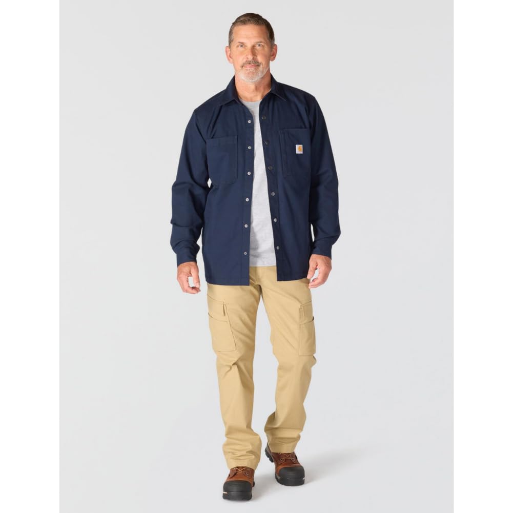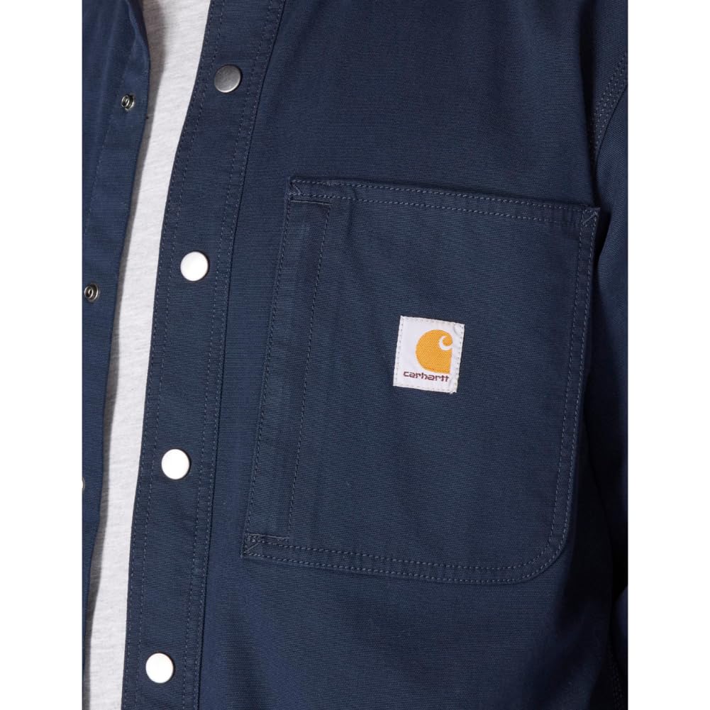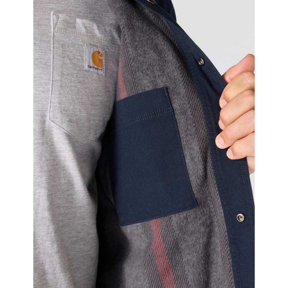 Description A workwear essential for a reason, this men's Carhartt shirt jac keeps you moving with ease. Durable cotton canvas has built in stretch for great range of movement. A fleece lining adds extra warmth on cold mornings.
