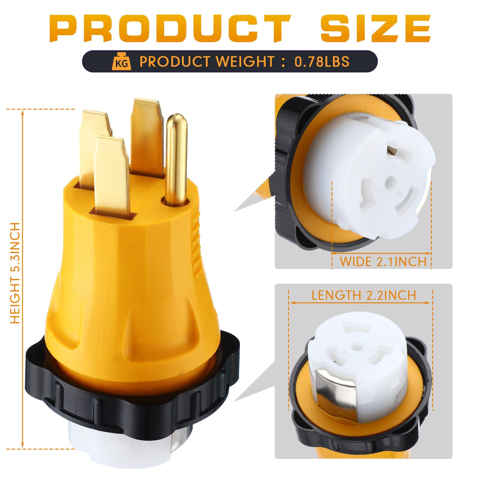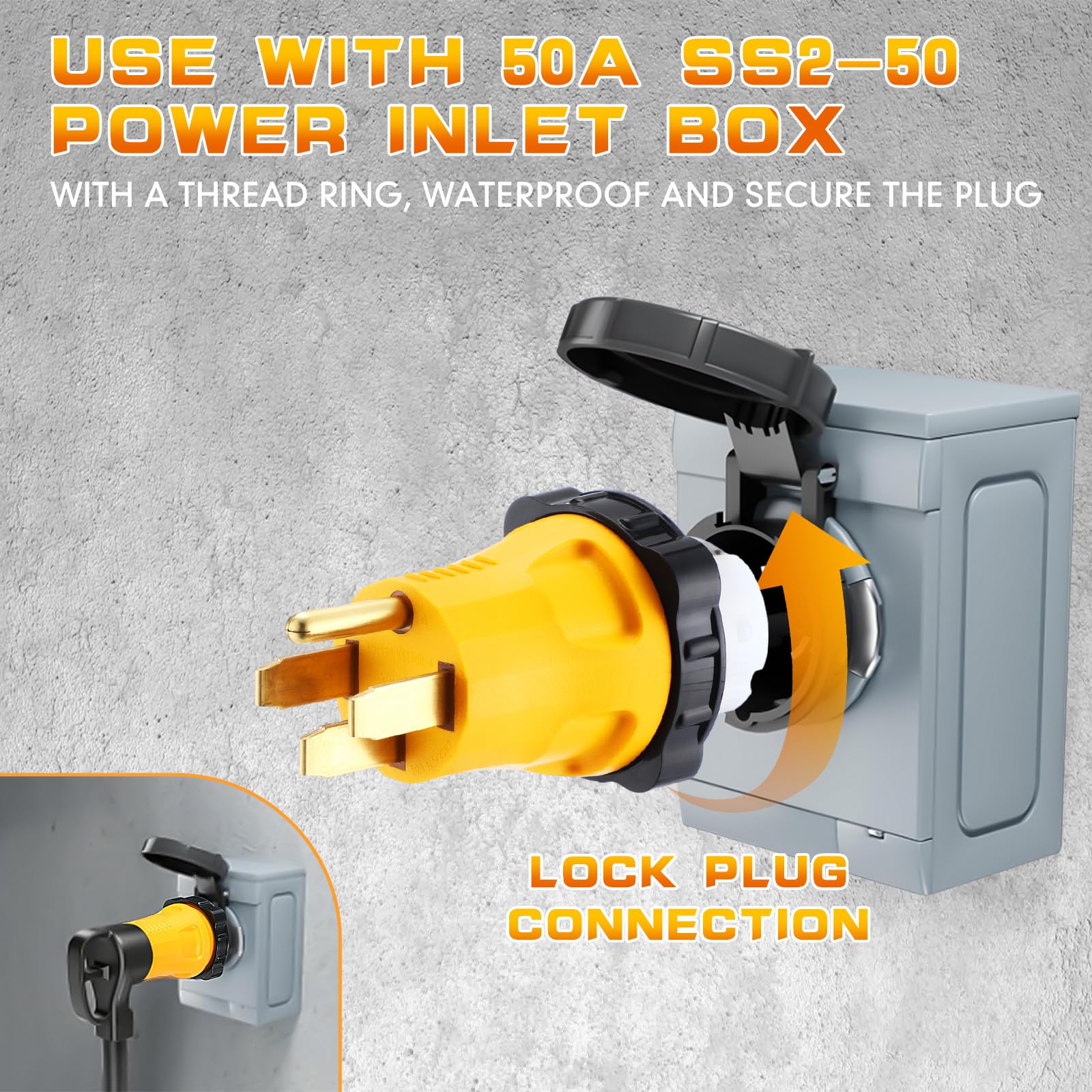 Molded Plug: heavy duty 50amp RV shore power adapter designed to withstand elements like wind, rain, snow, soil, and rocks for long lasting durability. Female receptacle locking (ss2-50r) feature to ensures safe power conduction; Suitable for you to connect the campground or generator power to your RV, motorhome, trailer or vehicle with built-in SS2-50P inlet