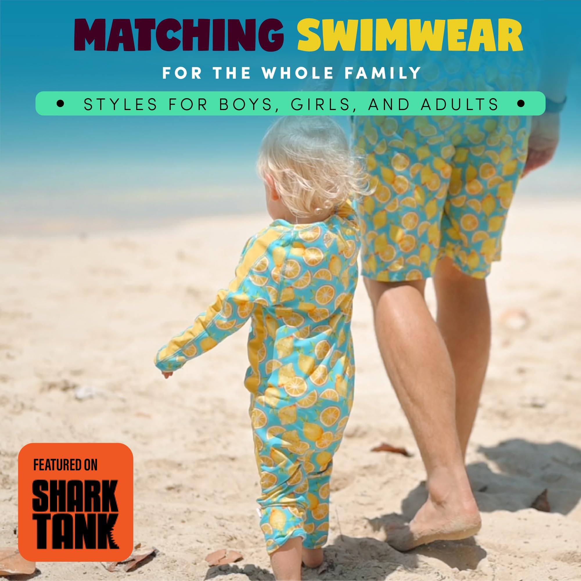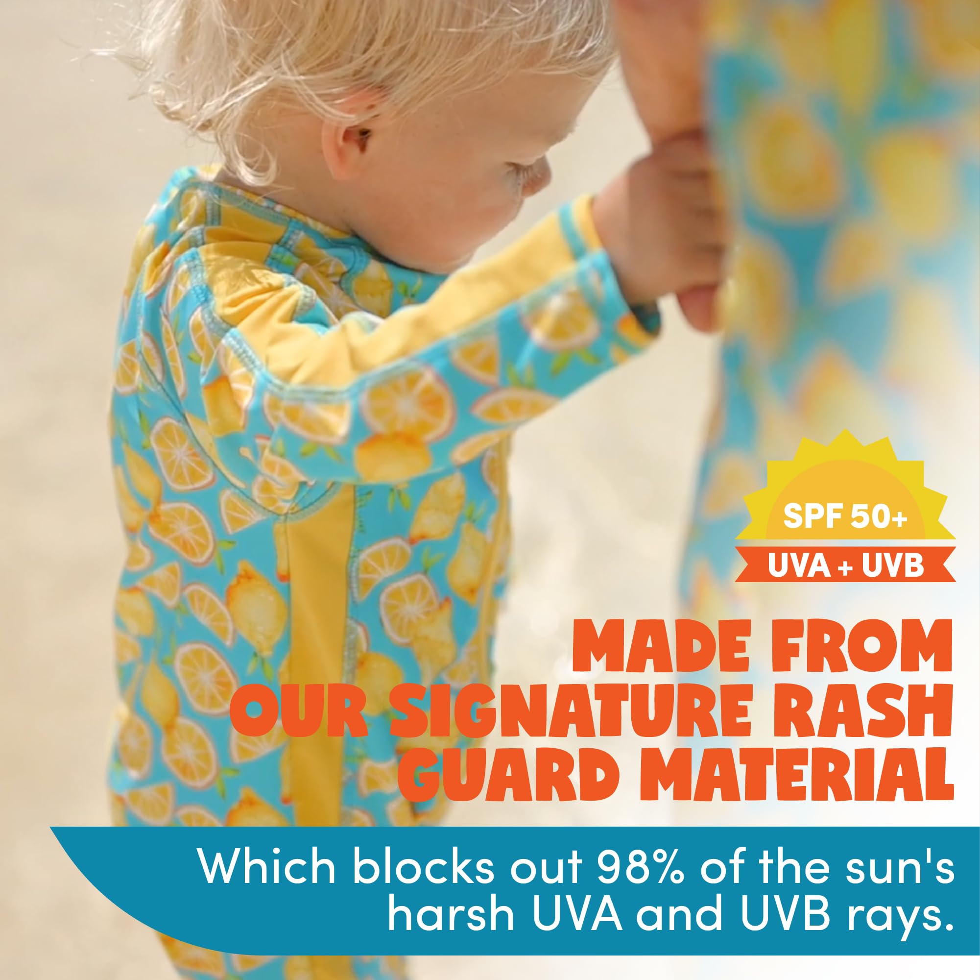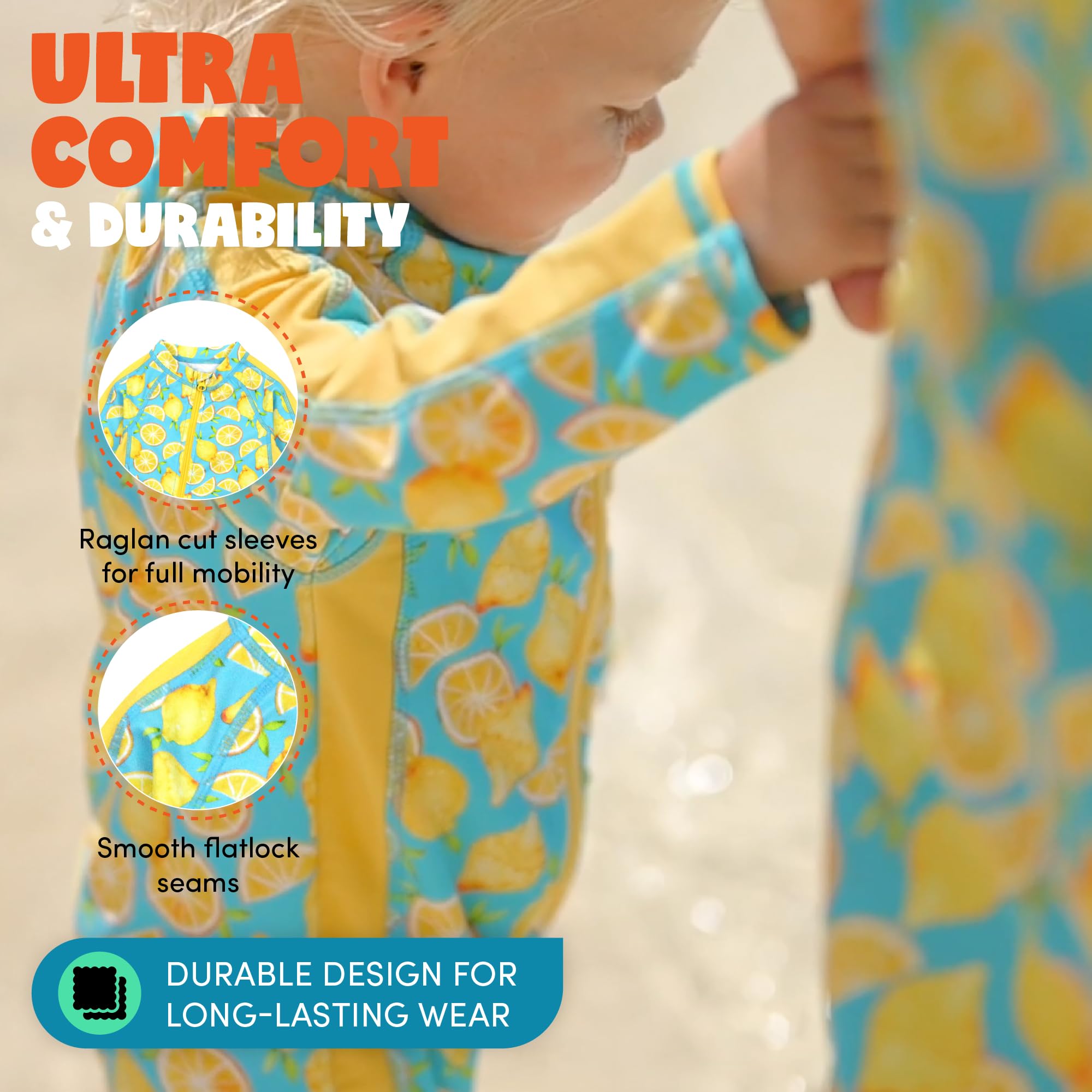 ULTRA COMFORT AND EASY CARE: Raglan cut sleeves for enhanced mobility and flatlock seams throughout the bathing suit provide for ultimate comfort and durability of the toddler swimsuit for boys giving full, free range of motion. Simply machine wash, line dry and your baby is ready to enjoy another day protected from the sun in this infant swimsuit.
