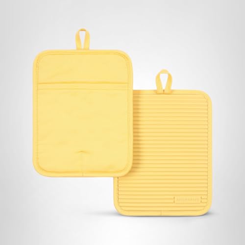 Perform your kitchen tasks safely with the KitchenAid Ribbed Soft Silicone 2-Piece Pot Holder Set. Made of waterproof silicone on one side and durable cotton on the other side for additional shield from the heat. Featuring a pocket with polyester lining for comfort and insulation. Each pot holder measures 7 inches wide by 9 inches long. They are heat resistant up to 500 degrees Fahrenheit. Coordinate these pot holders with coordinating KitchenAid Ribbed Soft Silicone Oven Mitts for a complete set.