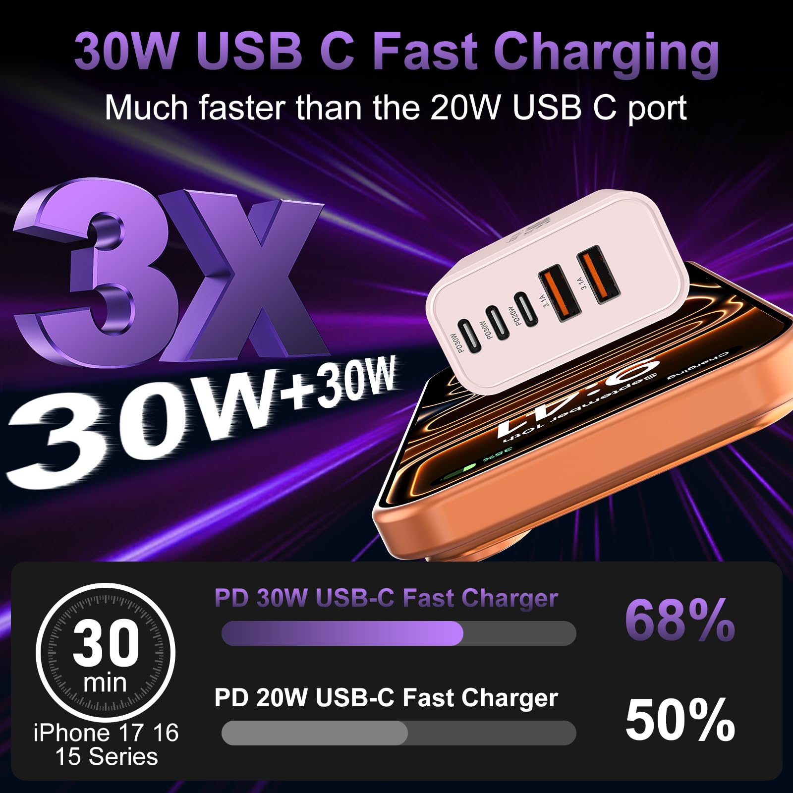 2-Pack 60W USB C Charger Fast Charging Blocks: Auorld 60W USB C Fast Charging Blocks support the Power Delivery and Quick Charge 3.0 fast charging functions with a total power of up to 60W. The USB-A port offers an output power of 3.1 A/5 V, while each USB-C port provides Max 30W output power, charge your Phone 16 15 Pro Max up to 65% in just 30mins, 10% faster than the original 20W USB C charger