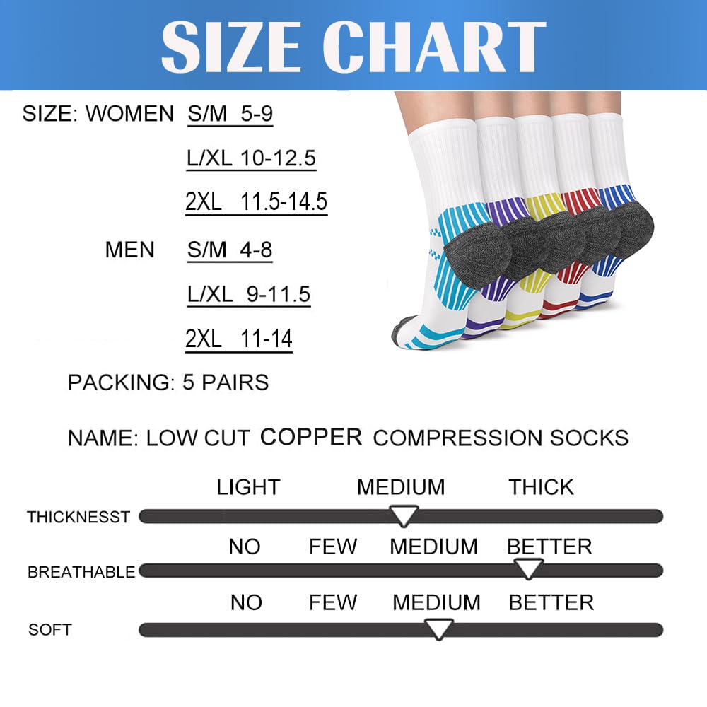 🏃IMPROVED COMFORT - Athletic copper compression socks can also be more comfortable to wear than traditional socks, as they provide a snug, supportive fit that can help prevent blisters and other foot injuries. The low-cut compression socks can also be made from breathable materials that help wick away moisture, keeping the feet cool and dry.