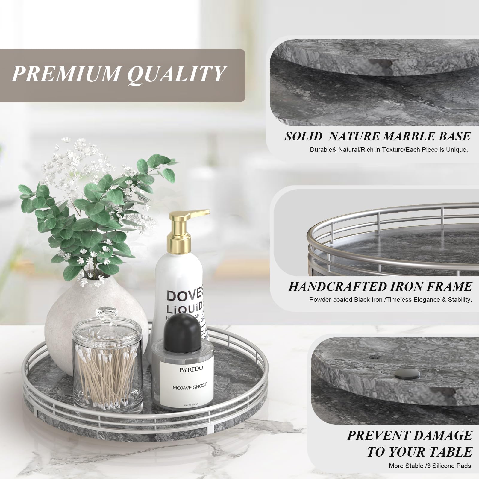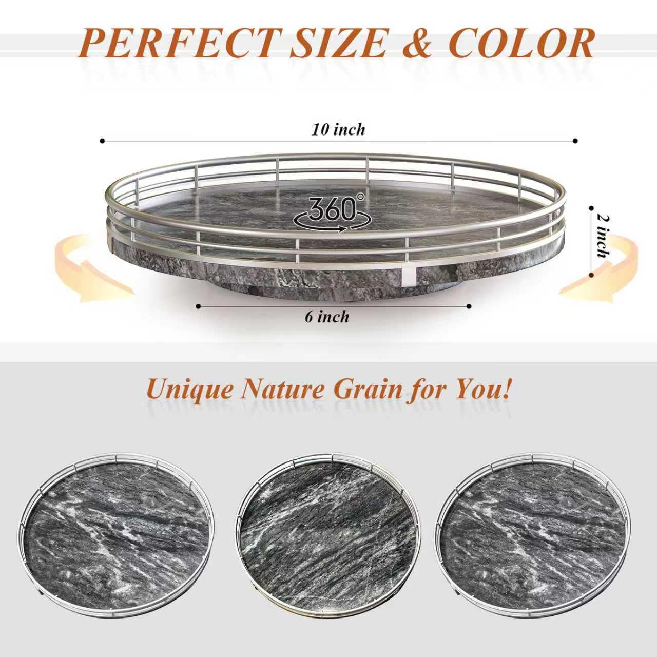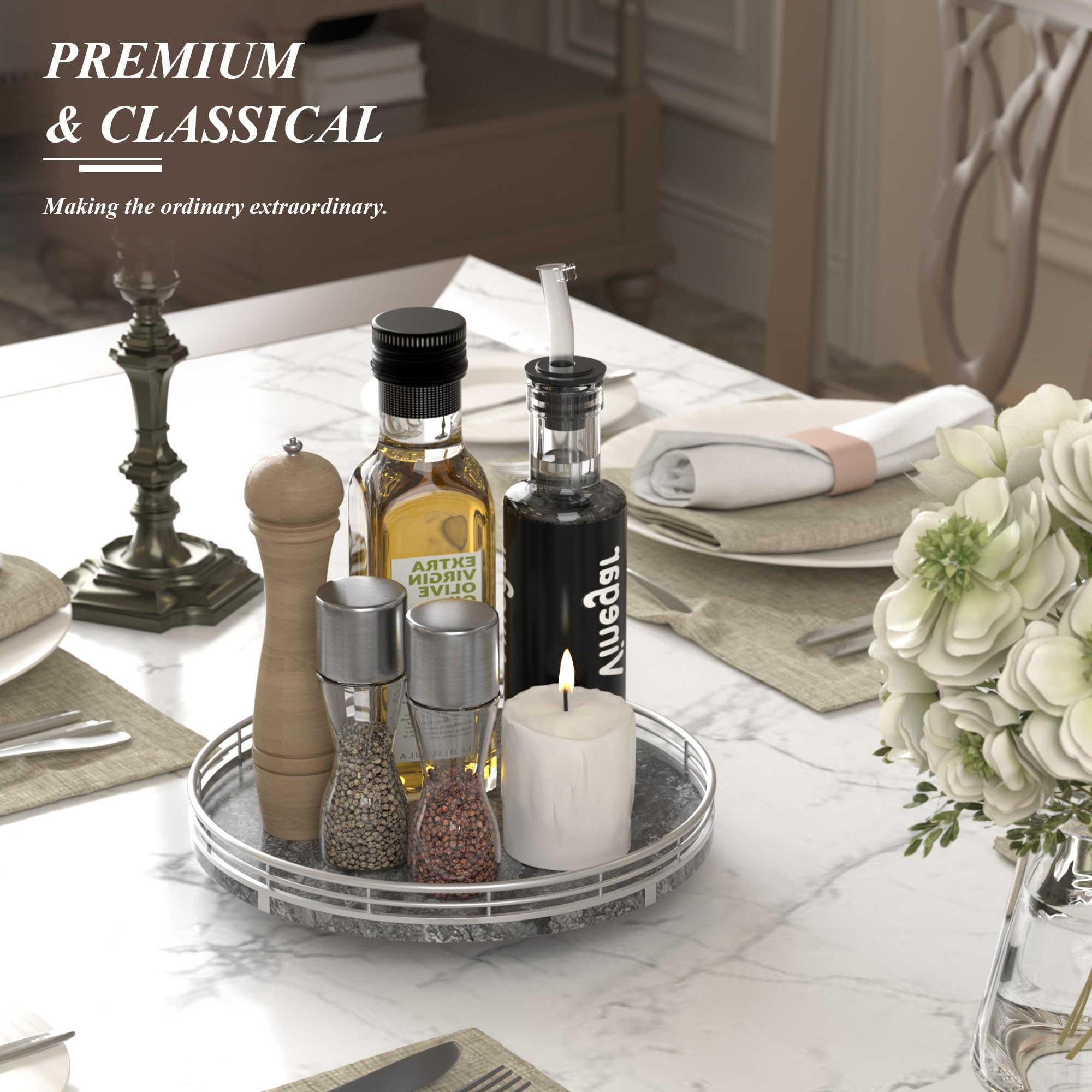 LUXURY & FUNCTIONAL DESIGN– The gray marble tray combines natural marble texture with a modern silver frame, making it an eye-catching marble lazy Susan for dining table and a stylish addition to any home decor.