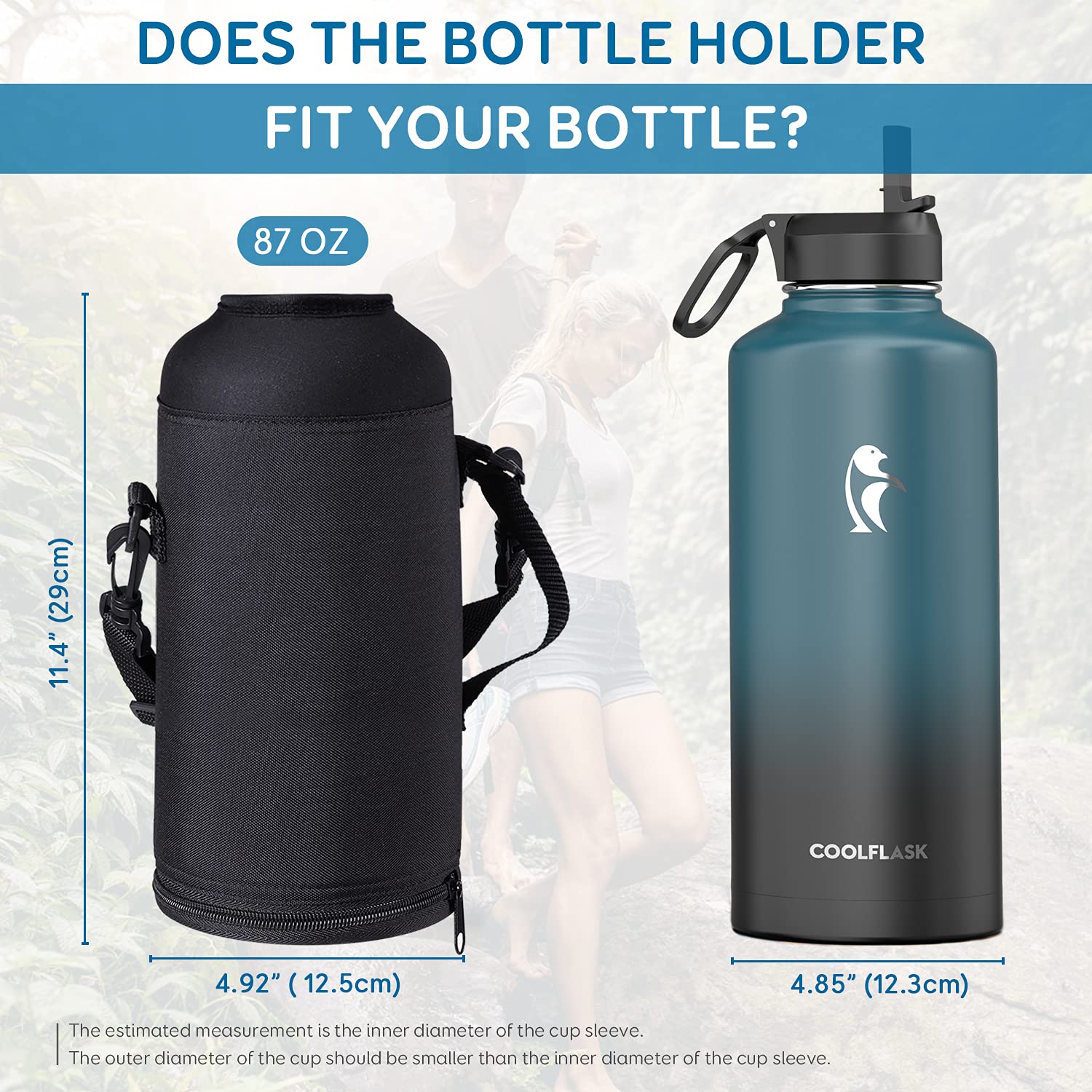 Fits Most Flask: This water bottle pouch is made to snugly fit most 87oz flasks from common brands such as BUZIO, SENDESTAR, Hydro Flask and others. Note the diameter of holder ≤4.90", height of holder body ≤11.4".