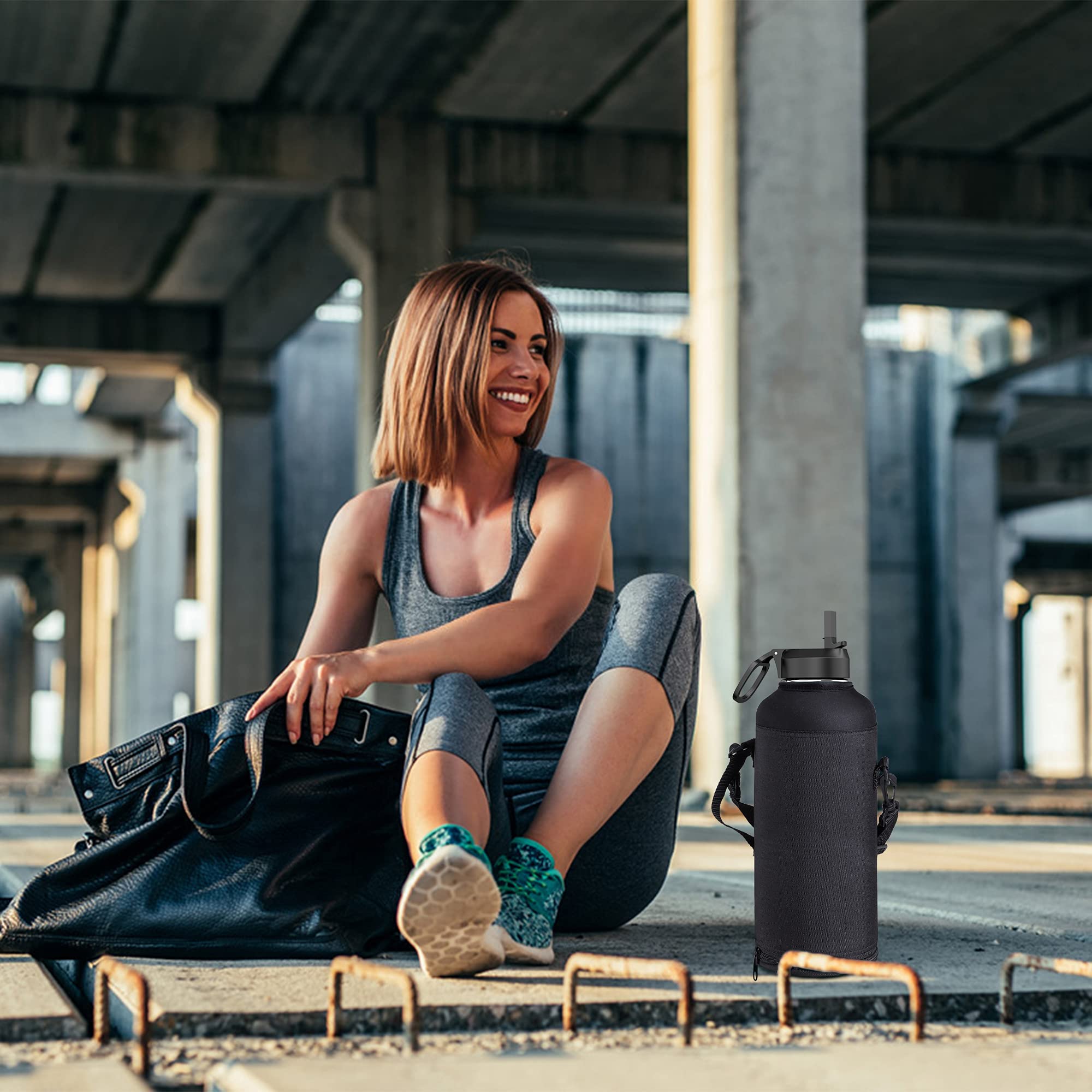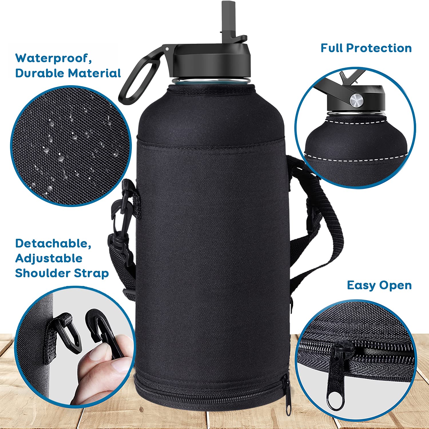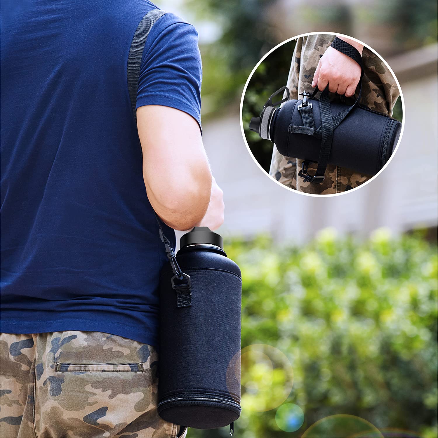 Portable & Handsfree: 1 handle + 1 padded adjustable shoulder strap for a safe and convenient way to carry bulky water bottles. The one handed side handle can help you easily hold and drink water from a 64-ounce flask. Ideal for camping, hiking, cycling, boating and other outdoor activities. The shoulder straps are 1 inch wide and comfortable, extending from 27 inches to 54 inches, making them ideal for adults and young people.
