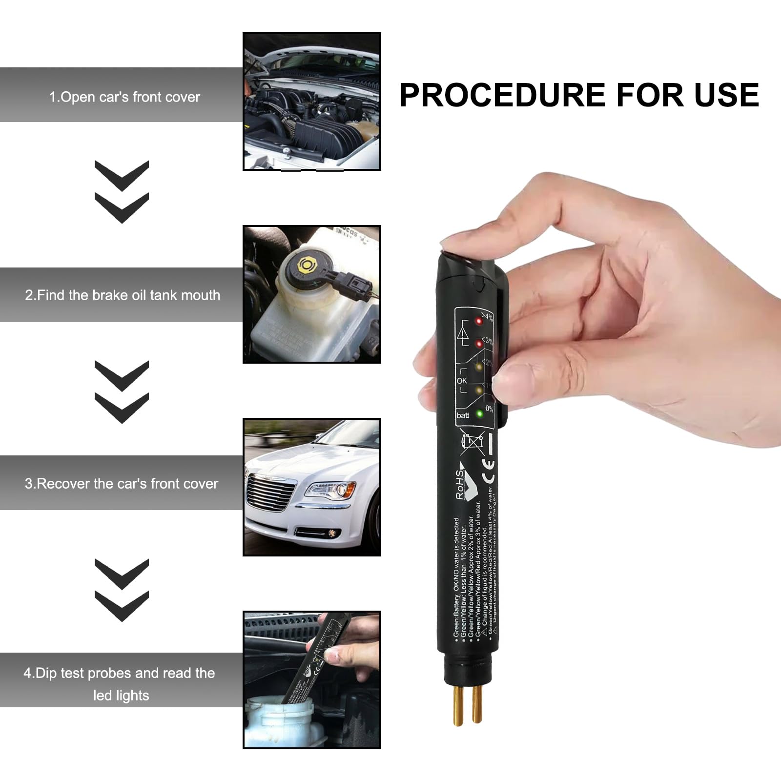 How to Use: This brake fluid tester is easy to operate. Press the top button and immerse the probe into the water tank to quickly test the brake fluid content. According to the LED light display on the test pen, you can quickly and accurately know the water content of your car's brake fluid