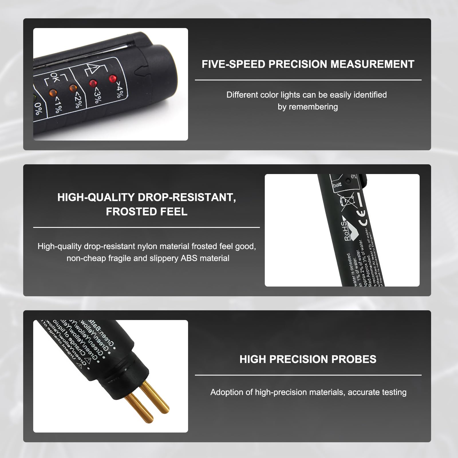 Easy to Read: Equipped with five LEDs and a metal probe, the practical tester can accurately display the percentage of water in the brake fluid when immersed in the brake fluid during use. The exact state of the fluid level drop can all be accurately reflected in time on the LED indicators