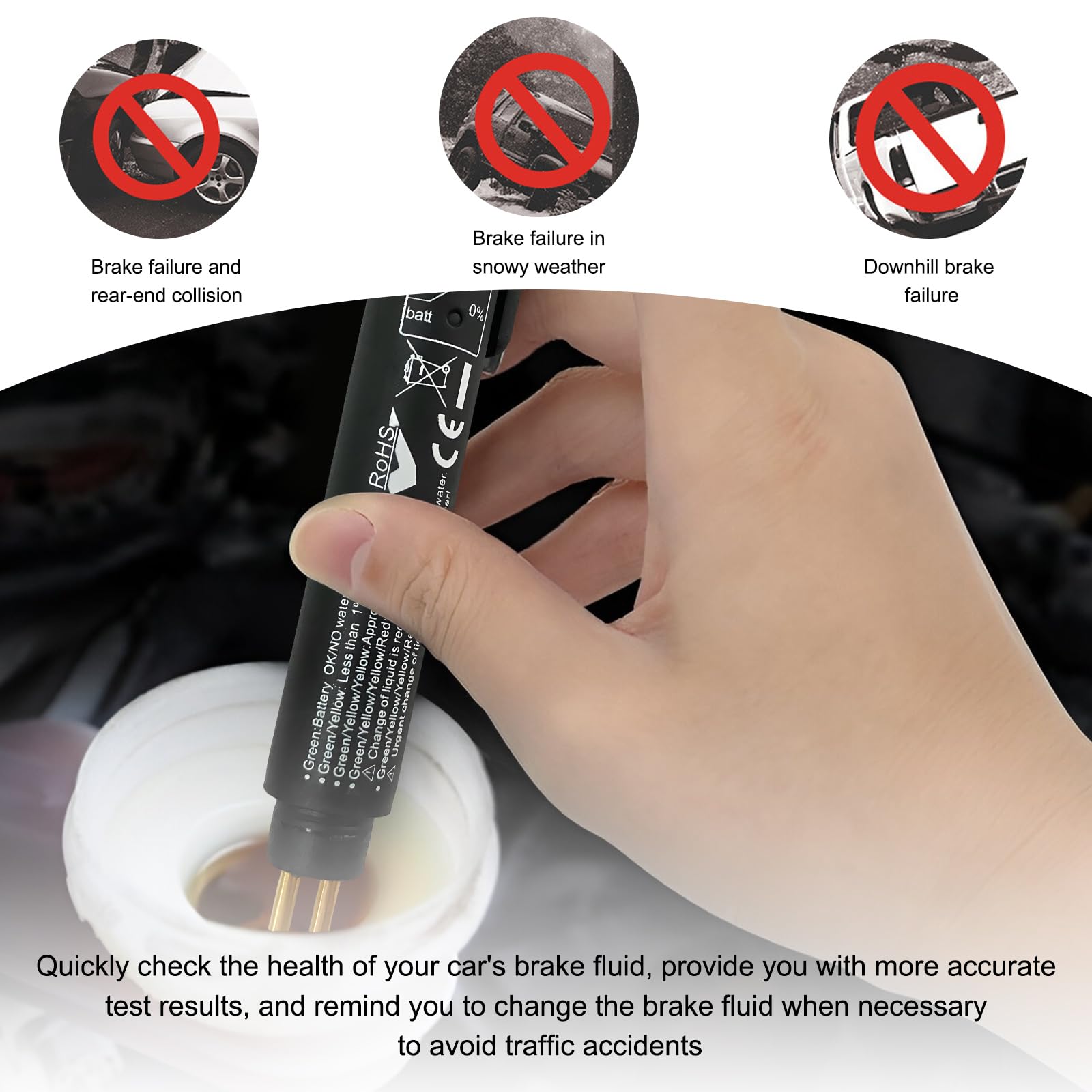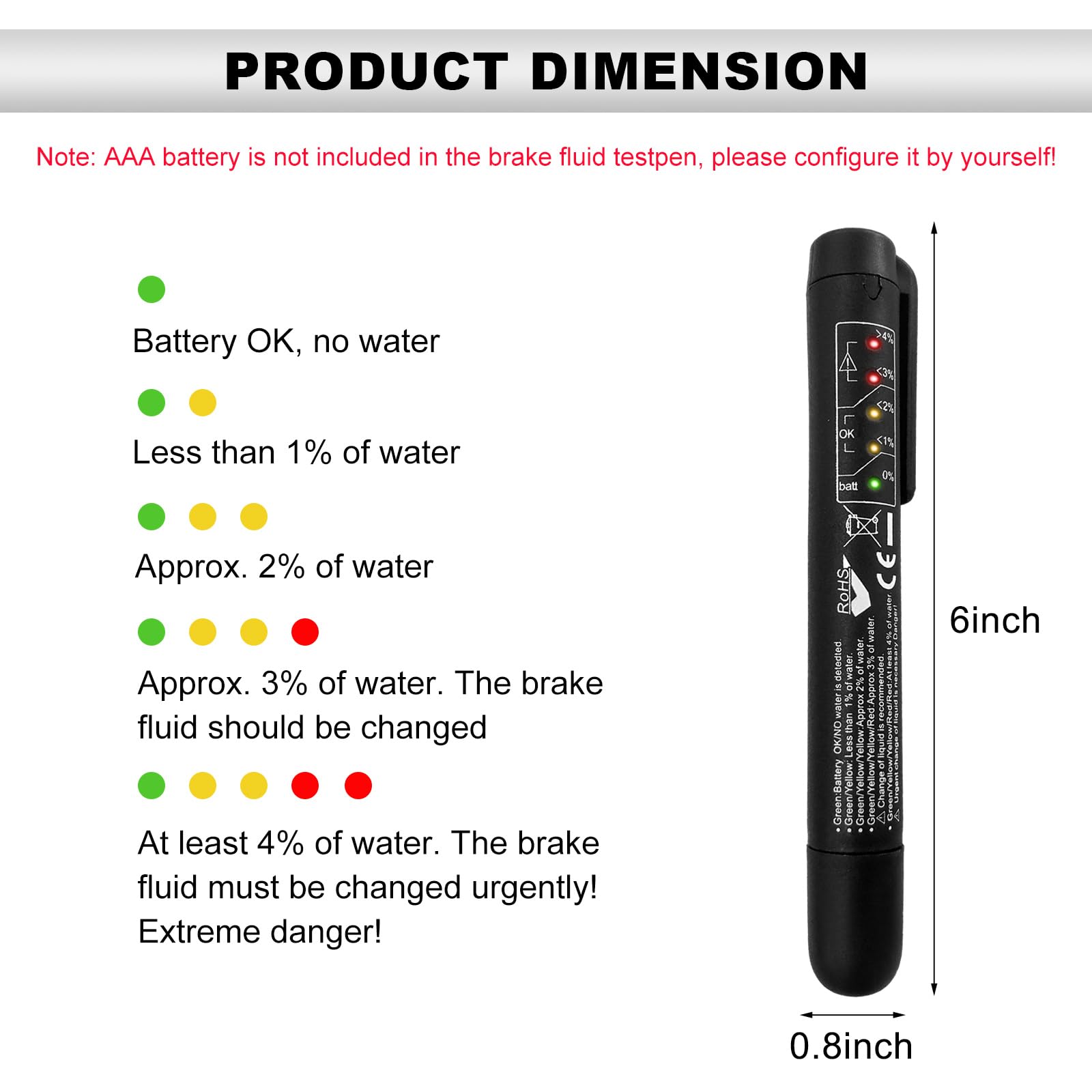 Specification: Material: Brass-Plated Metal Quantity: 1 PCS Color: Black Weight: 27 g Size: 6×0.8 inches Voltage: 9-15 V Feature: Accurate, Reliable, Durable Fit Type: Universal Fit If you are looking for a brake fluid testing pen, then this is the product you need! -The brake fluid test pen is ideal for professional inspections, workshops, garages and home use. -The automotive brake fluid test pen has a smooth surface and is comfortable to the touch. -The lightweight car brake pen is designed with no cable connector, easy to carry and won't take up much space. Notes: -Metal additives in the brake fluid may cause the red light to come on. -Please rinse the test probe with water after each use. -This product does not include AAA batteries, please purchase your own. -The indicator light is green, indicating normal power/no water. -The indicator light is green/yellow, water content is less than 1%. -The indicator light is green/yellow/yellow, the water content is close to 2%. -The indicator light is green/yellow/yellow/red indicates that the water content is close to 3% and it is recommended to replace the brake fluid. -The indicator light is green/yellow/yellow/red/red, indicating that the water content is higher than 4% and the brake fluid must be replaced immediately.