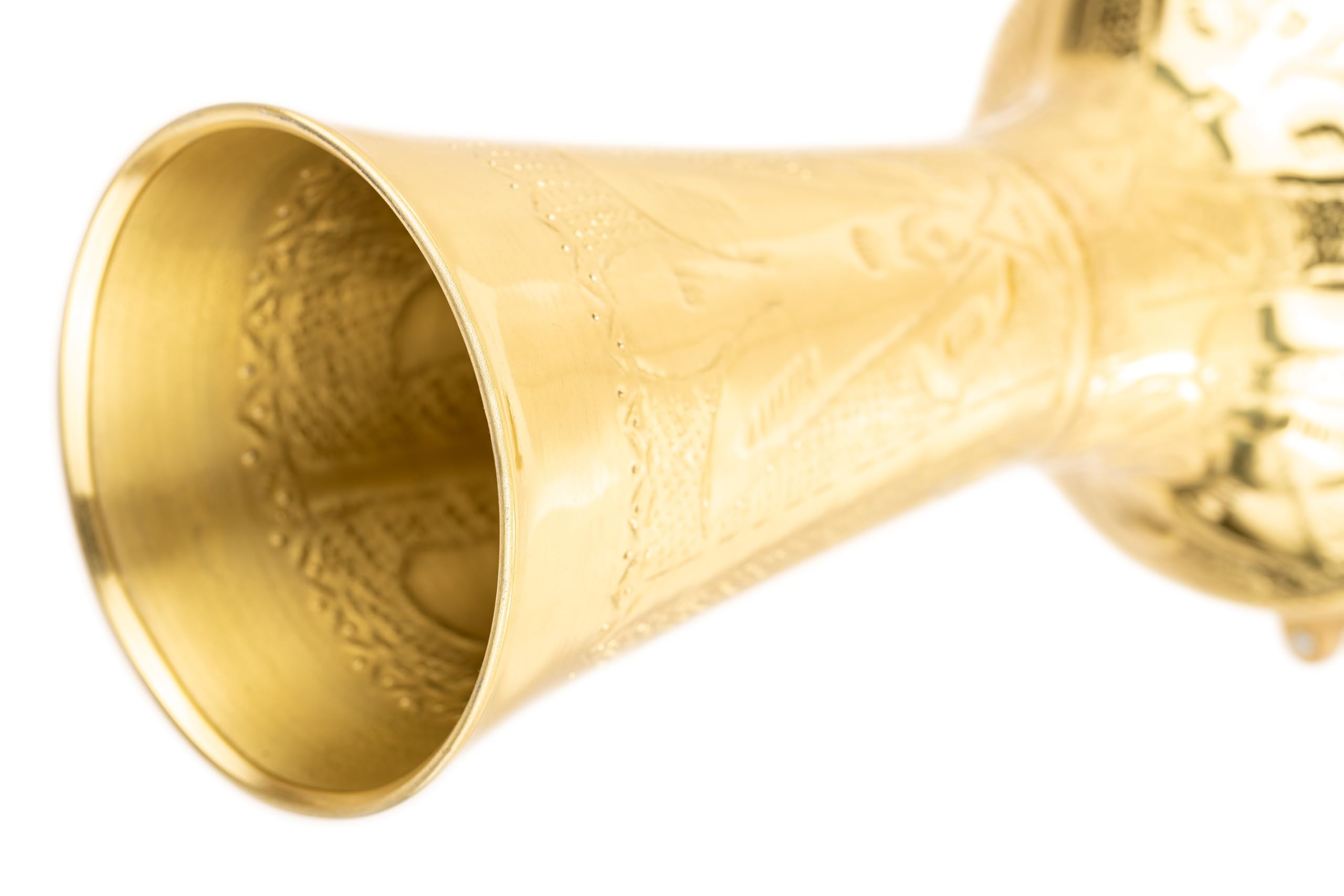 BY THE NUMBERS: the brass plated copper shell measures 8" W x 14 3/4” H; head measures 7 1/2"