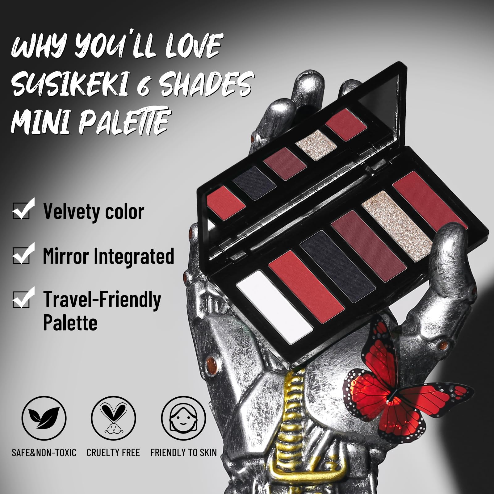【Bold Red Shade for Striking Eye Makeup】This SUSIKEKI 6 colors mini palette highlights an intense red shade at its heart—paired with matte black, burgundy, and shimmering silver. Designed for standout looks, the red shadow delivers powerful color impact, perfect for edgy, theatrical, and costume makeup.