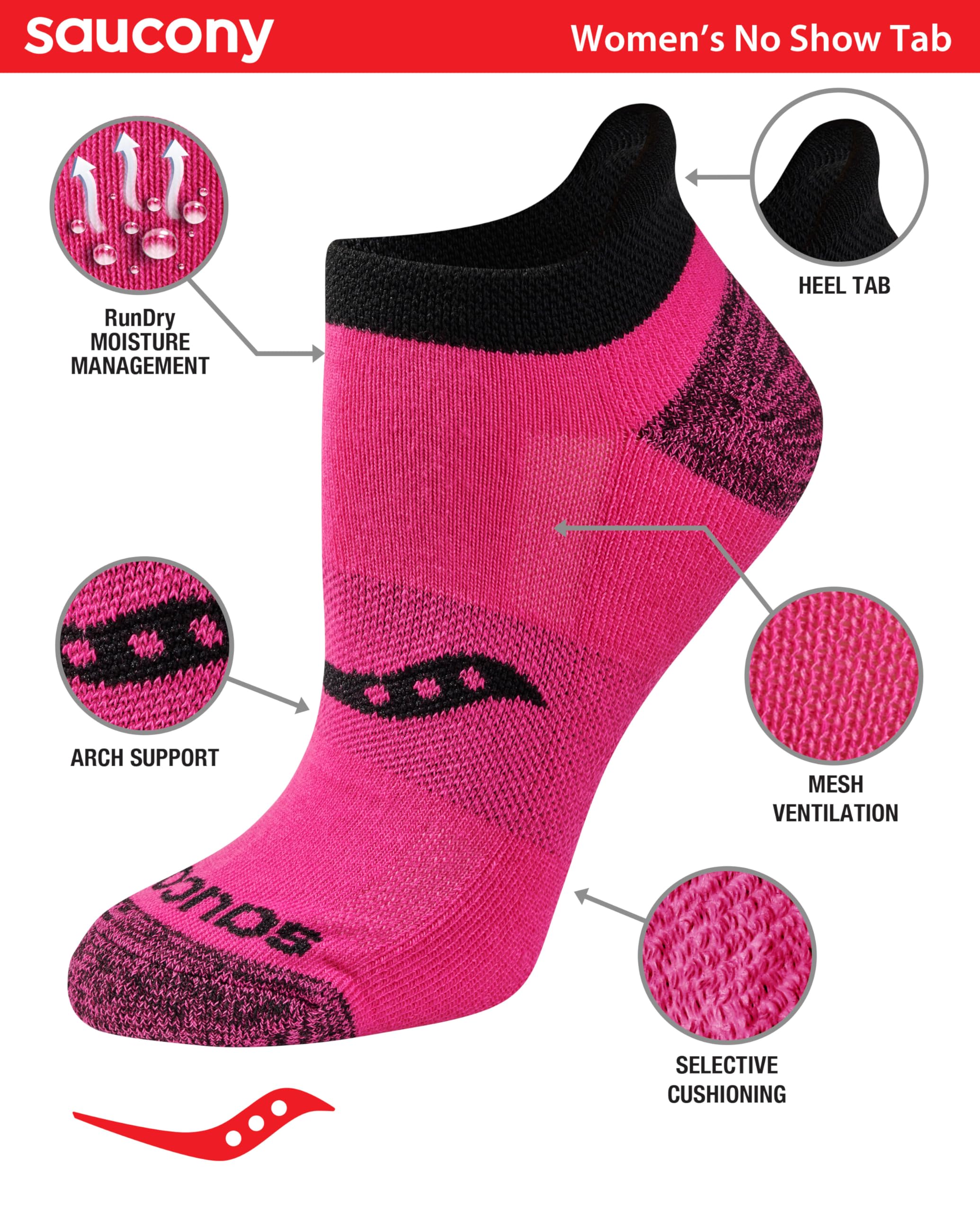 Description Saucony Women's Performance Heel Tab Athletic socks are a perfect combination of comfort and support. Great for the toughest training sessions. Features include heel tab design for added protection and comfort, RunDry moisture management to keep feet dry, arch support for an improved and secure fit, Mesh ventilation that enhances breathability and comfort, targeted zone cushioning in high impact areas for added comfort, and comfort toe seam for reduced irration.