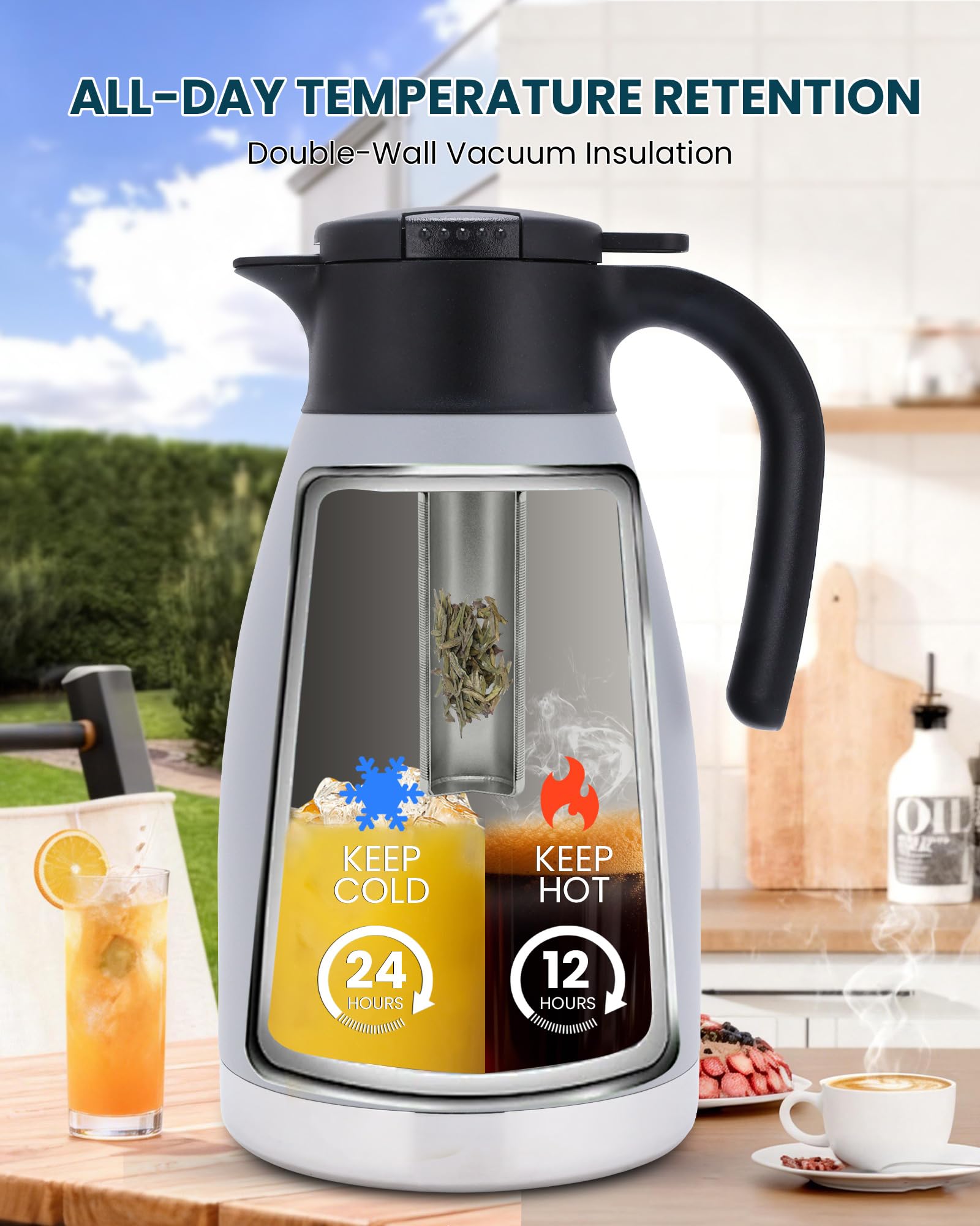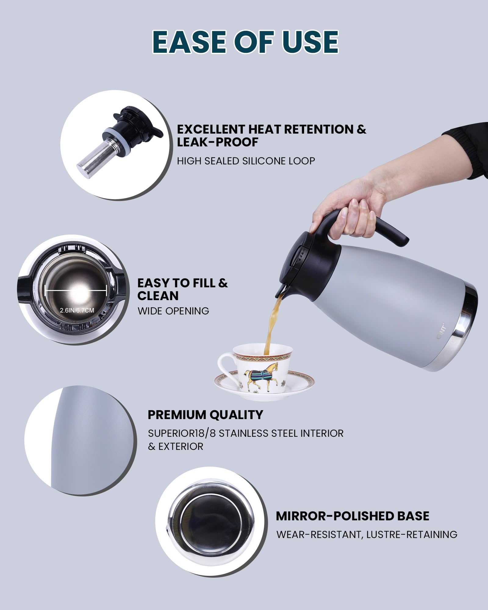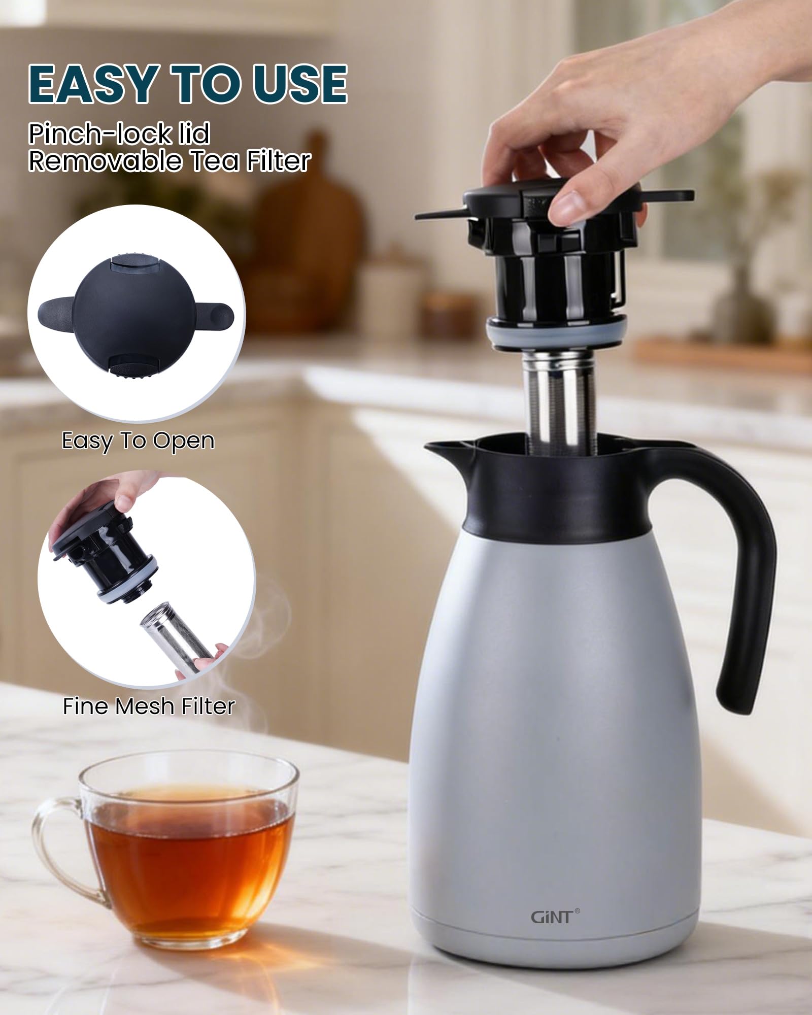 ✅ Large-Capacity Tea Carafe with Infuser – This 74oz (2.2L) thermal coffee carafe with infuser also serves as an insulated tea carafe, storing 10+ cups; dimensions 11.6"×6.5", weight 2.4 lbs, designed for offices, events, and all-day beverage service. GiNT makes high-volume refreshment effortless.