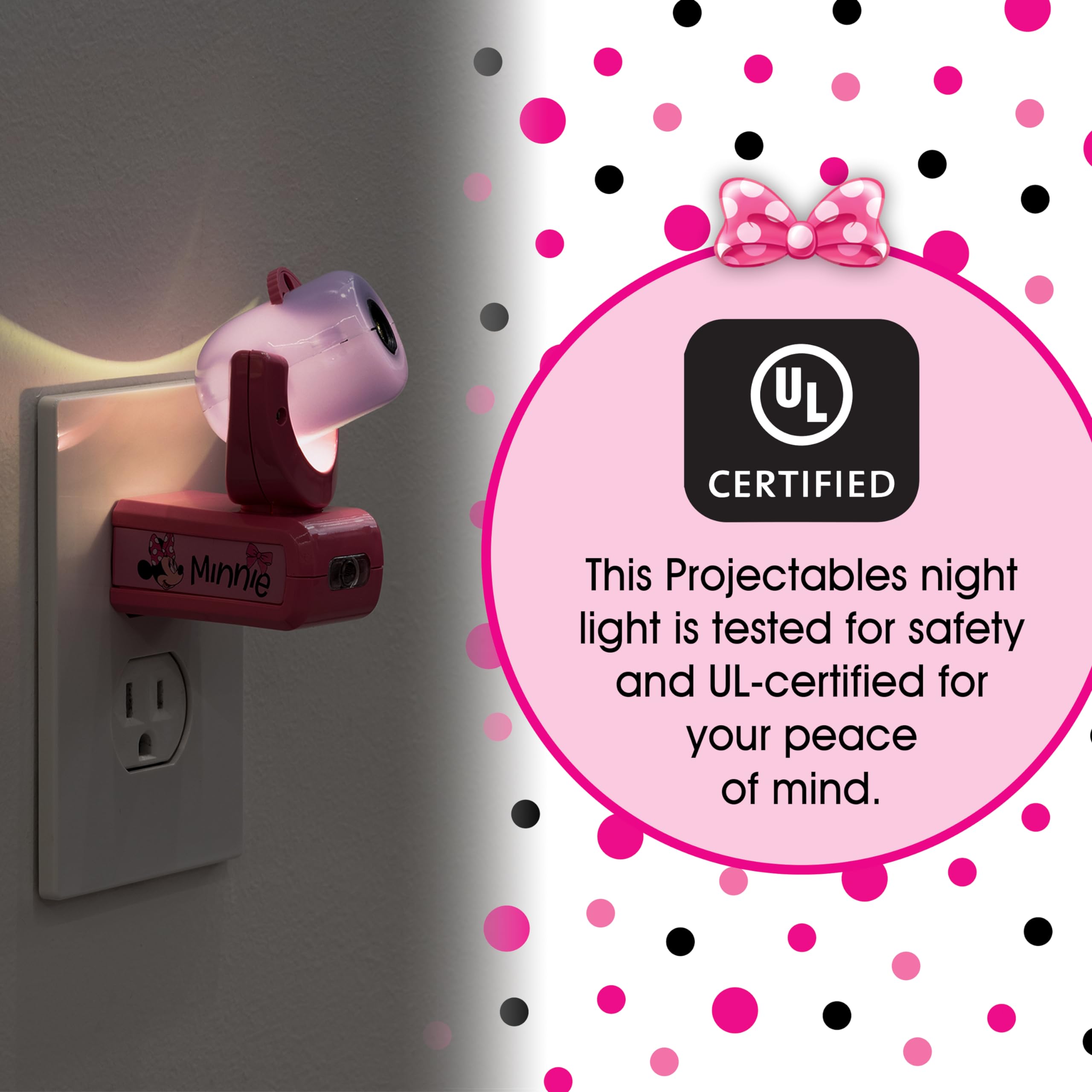 The Minnie Mouse Projectables LED Night Light fills the room with six vibrant images featuring the iconic lady-mouse herself! This night light effortlessly combines Disney charm and modern technology into one special package. When plugged in and on, your favorite of six magical images are brilliantly displayed on your ceiling, wall or floor—this patented Projectables feature provides you with your own Disney showcase! The base of the light also provides a soft glow to any bedroom, playroom, nursery or bathroom. With the loveable likenesses of Minnie and friends projected onto your ceiling, wall or floor, this light will guide your way at night and lull you to sleep when you climb into bed. Much more than just an adorable Dinsey-themed product, this Projectables night light uses light-sensing technology that automatically turns the light ON at dusk and OFF at dawn—giving you light when you need it the most. Energy efficient and cool to the touch, this night light’s long-life LED saves you money all year long by consuming less power. Have your room lit throughout the night with the charming Minnie Mouse Projectables LED Night Light!