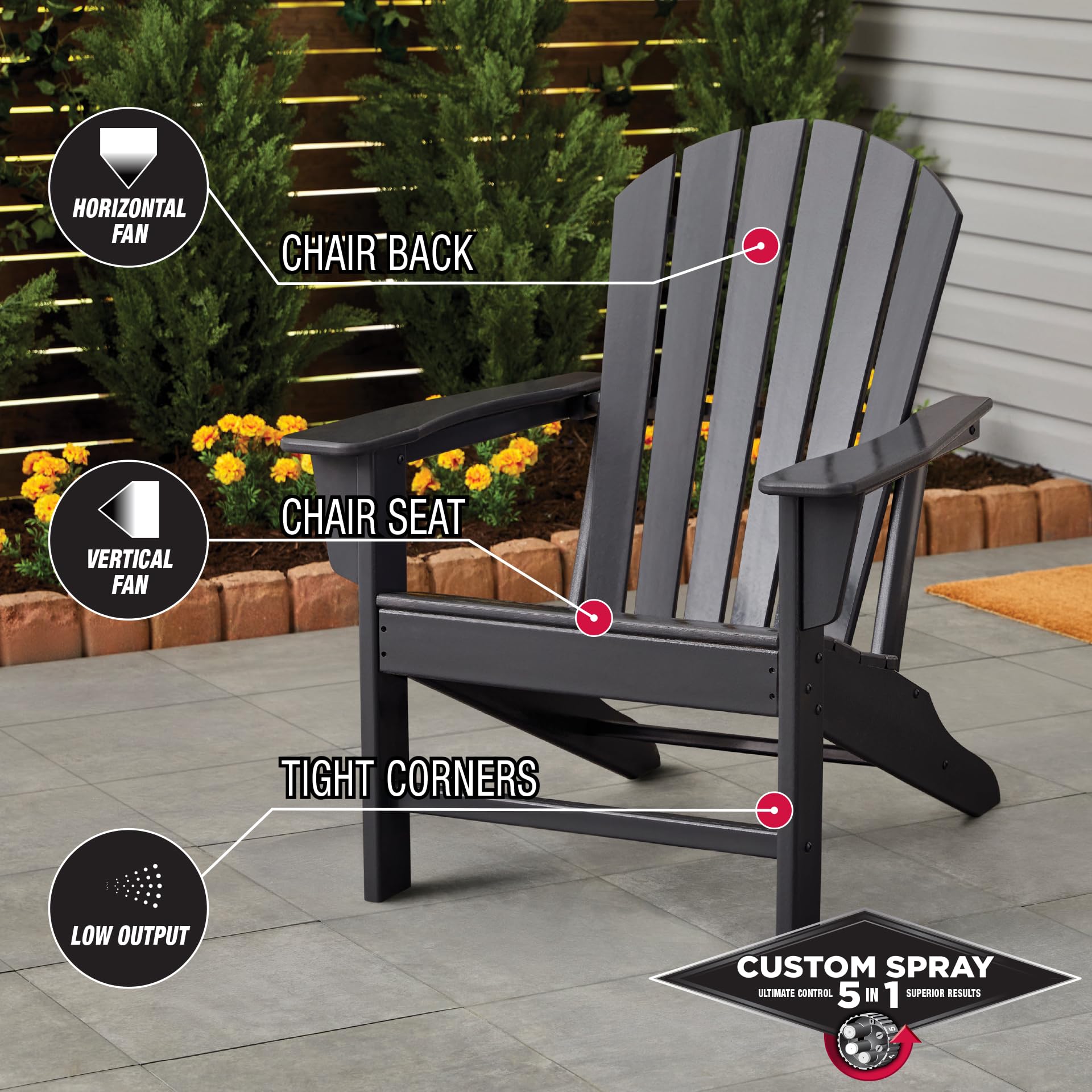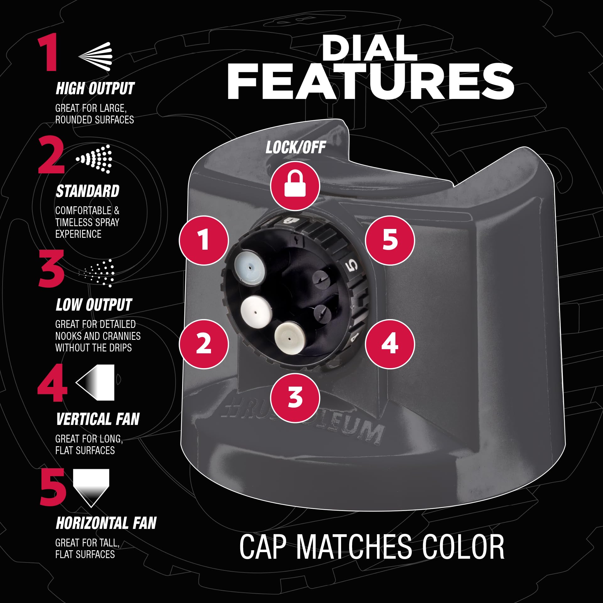 Custom Spray 5-in-1 dial offers five spray paint patterns for ultimate control and superior results