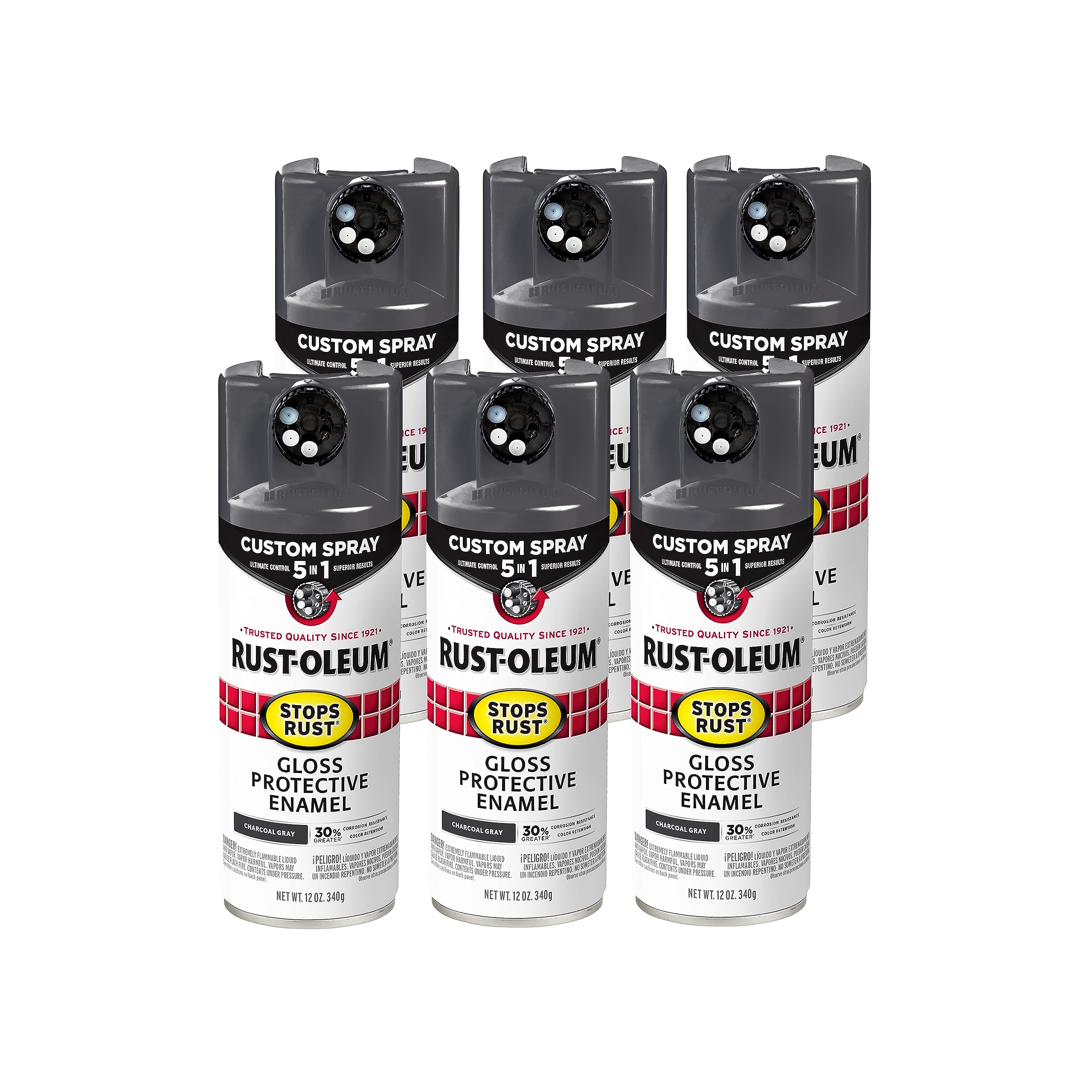 Rust-Oleum Stops Rust Protective Enamel with Custom Spray 5-in-1 technology provides a premium spray paint experience with unlimited ways to get your project done right. The innovative Custom Spray 5-in-1 dial allows you to choose from 5 spray paint nozzles for ultimate control and the advanced Stops Rust formula provides 30% greater corrosion resistance and color retention compared to the standard Stops Rust formula. Use the high output spray nozzle for large curved surfaces, standard for a traditional experience, low output for details and corners without drips and runs, and vertical or horizontal fans for flat surfaces. When you're done, turn the dial to the locked position and store the remaining spray paint for your next project.