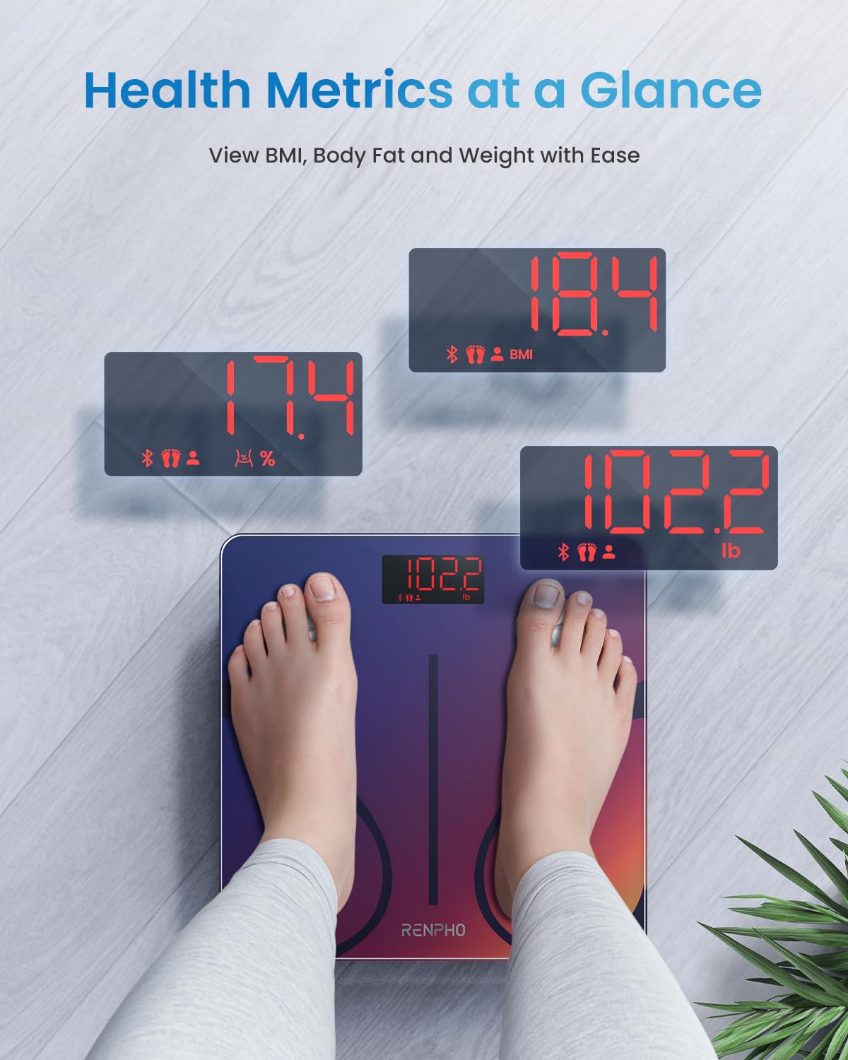 13 essential body measurements. Body weight shows on the scale, other body composition data including weight, BMI, body fat percentage stored in the app. Track everybody's metrics change on Renpho Health app