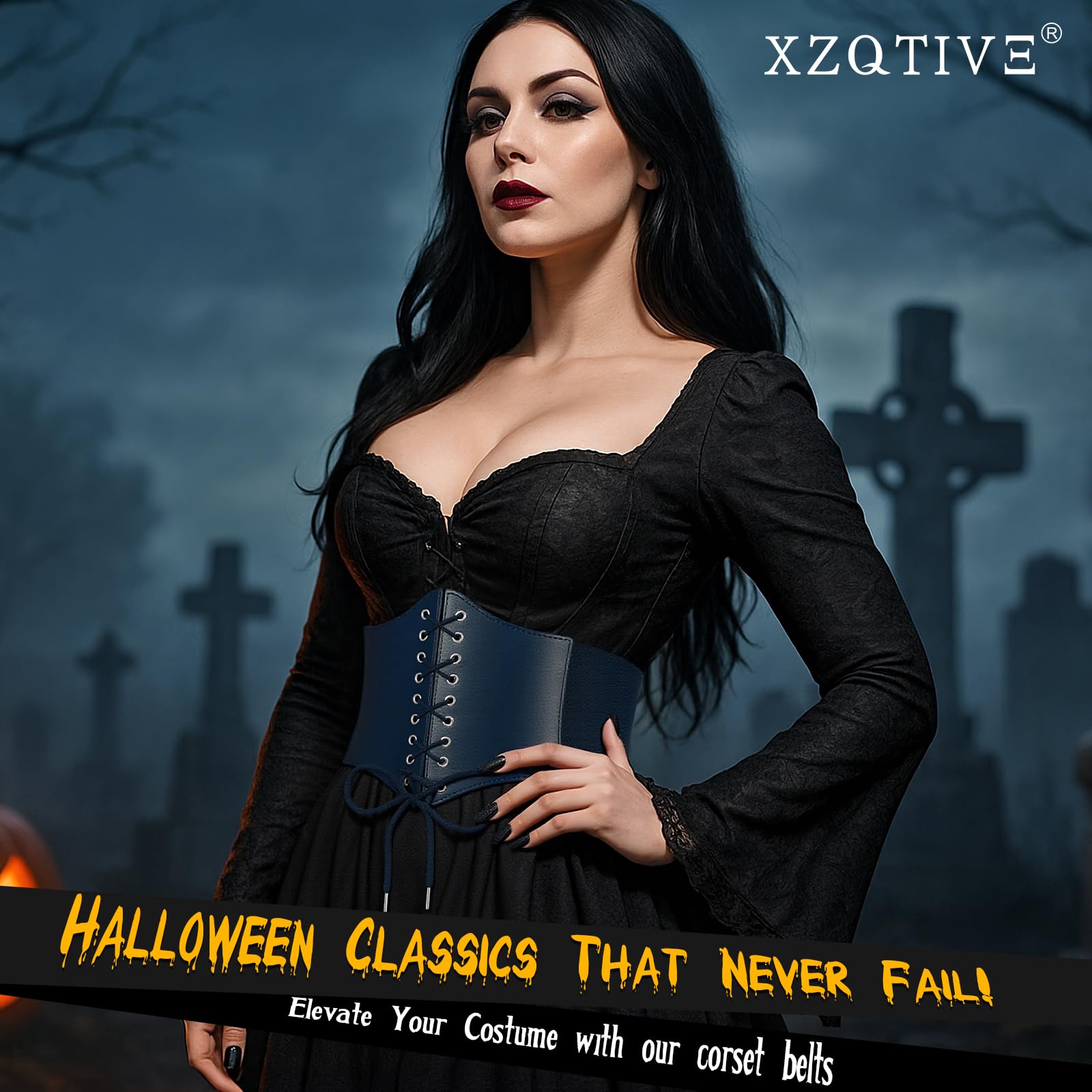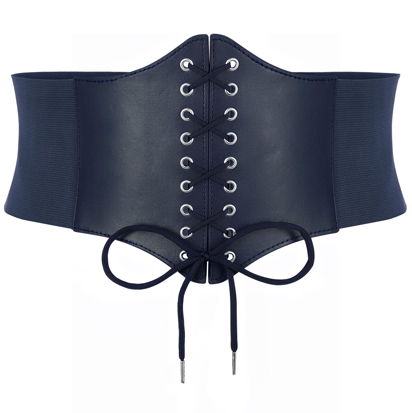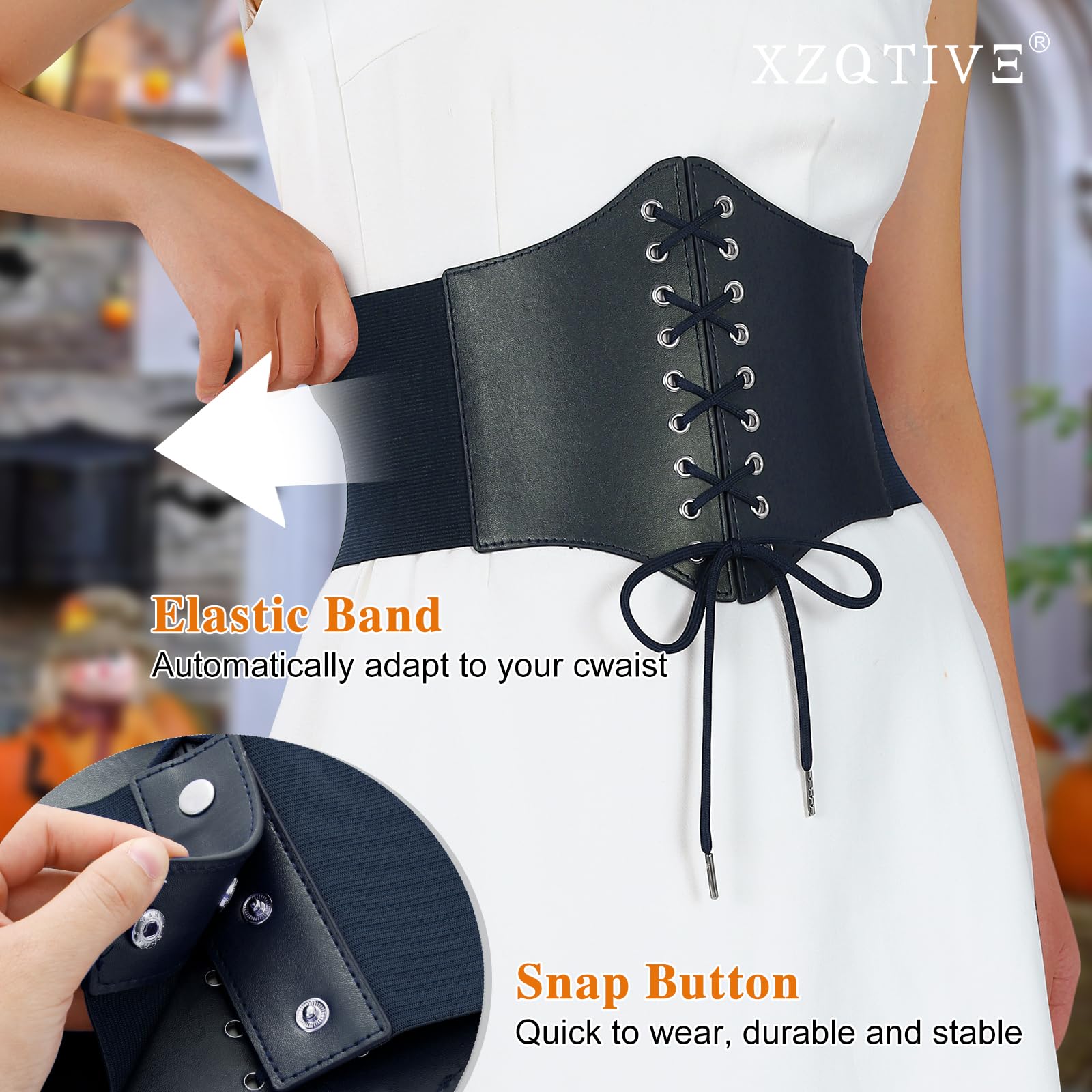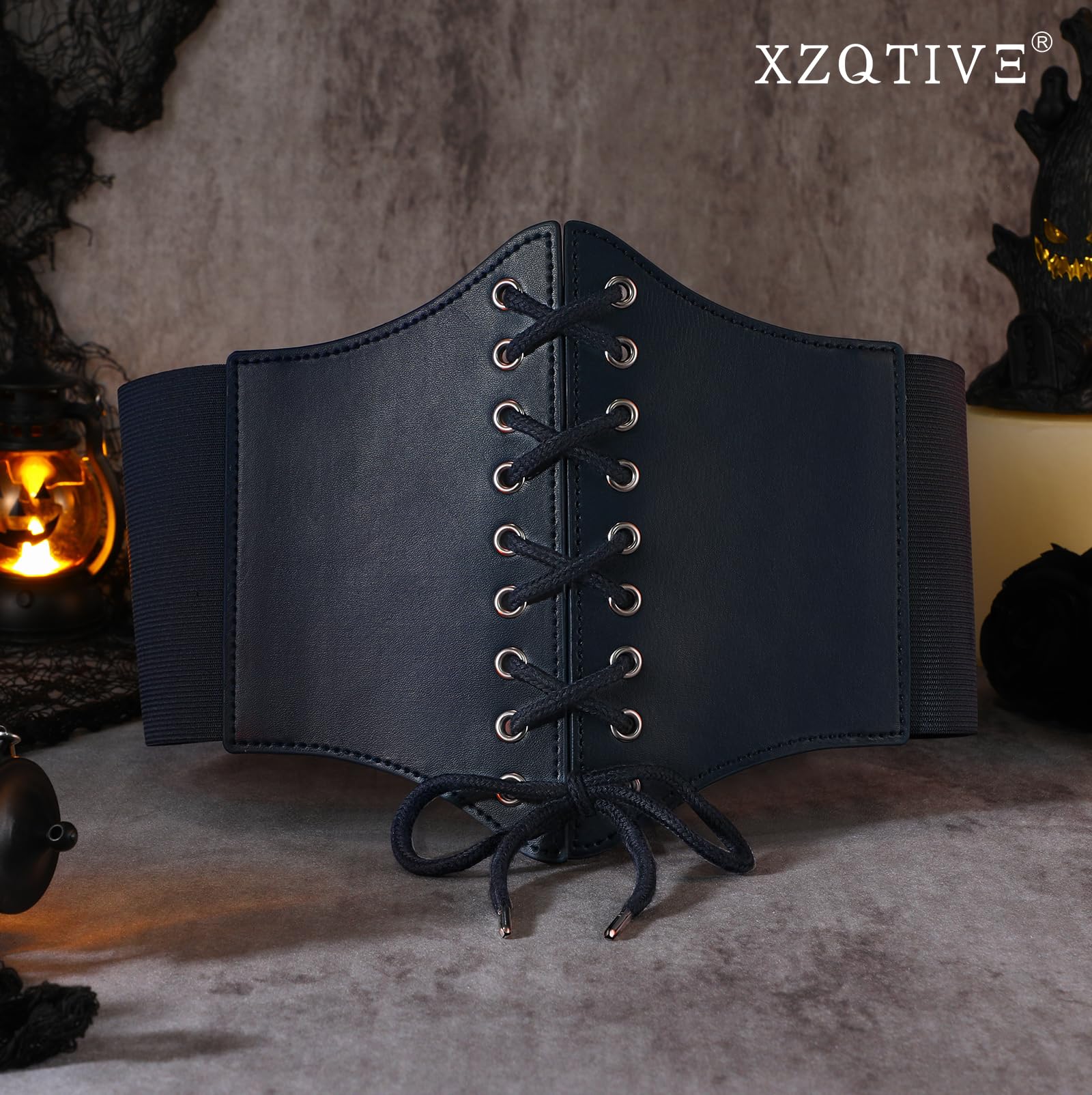 ➜ Black Corset Belt for Waist - Wide Costume cinching belt with tied corset leather on the front, elastic webbing band on the back, snap button closure to lock the belt,
