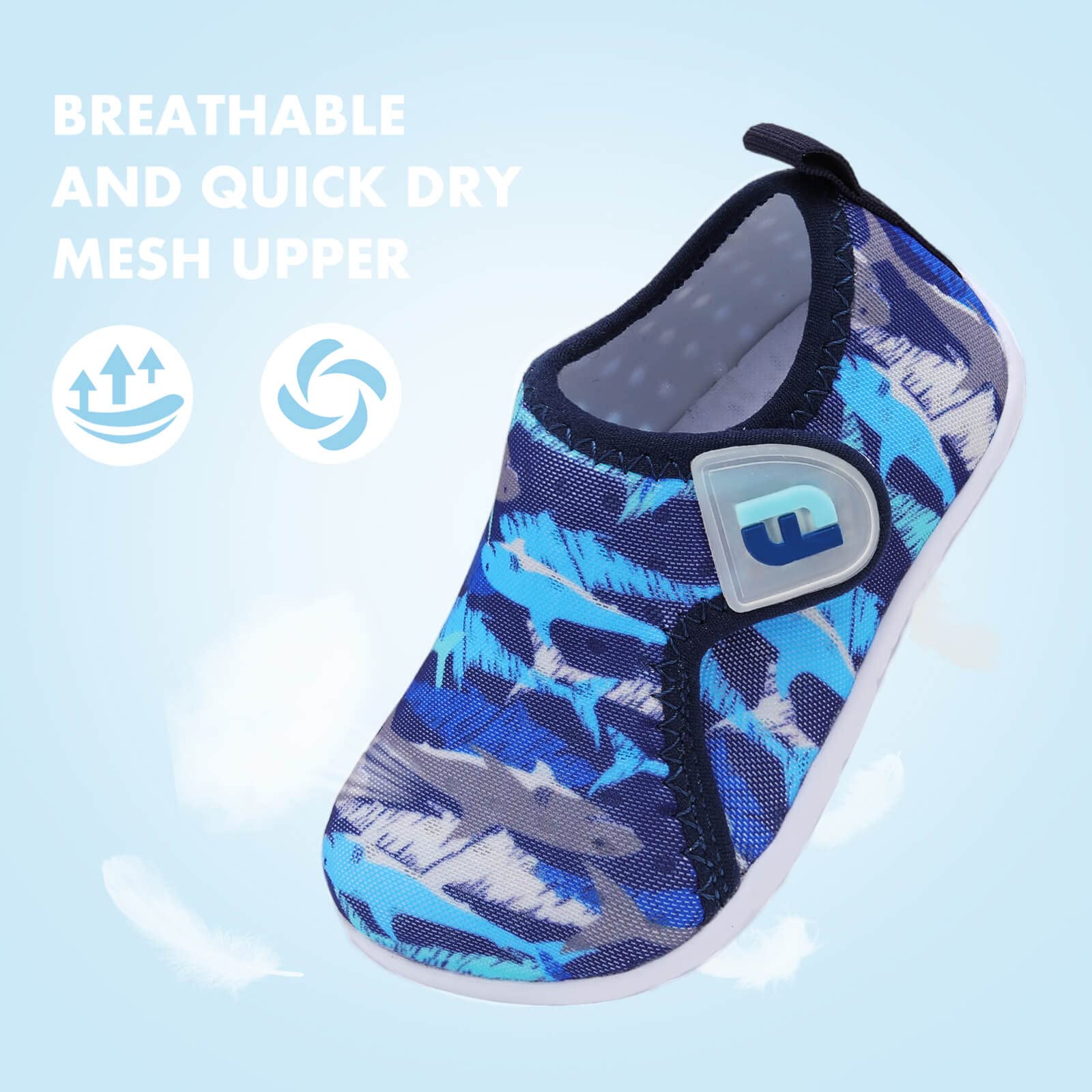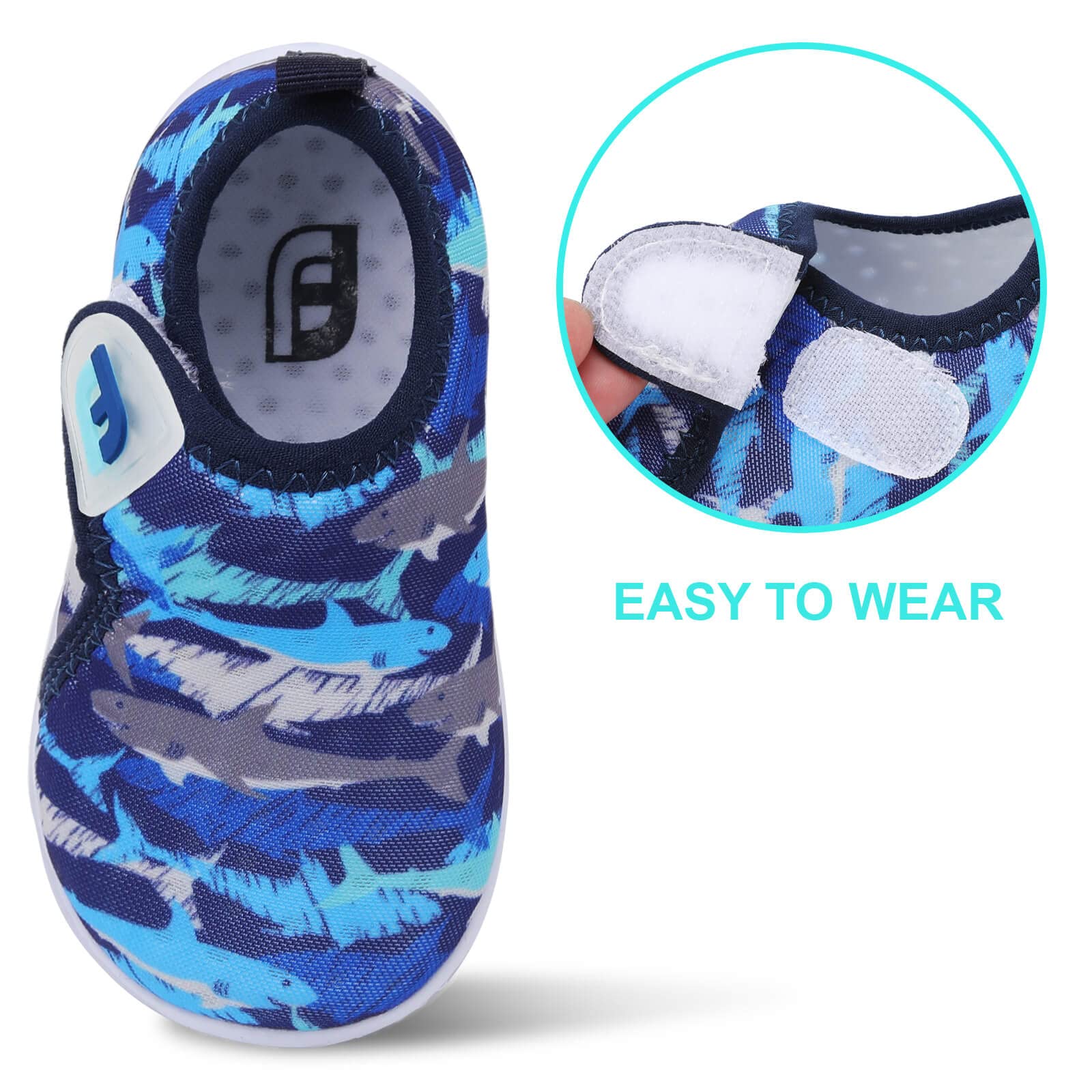 Convenient to wear: Slip on and Hook-and-Loop design makes these toddler water shoes easy to wear and take off. Elastic shoe neck design reduce abrasions when walking or running