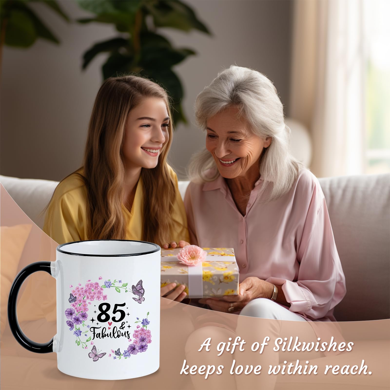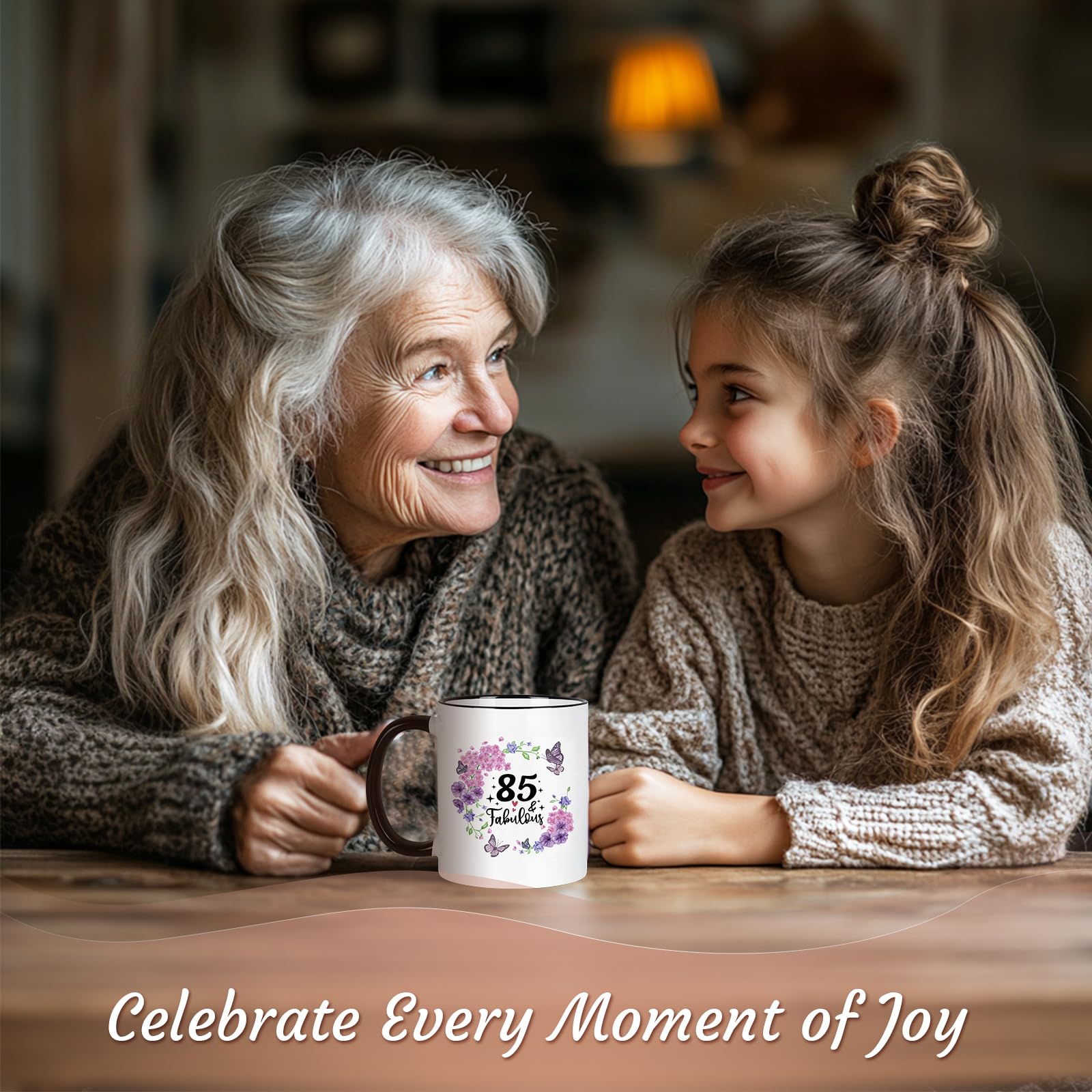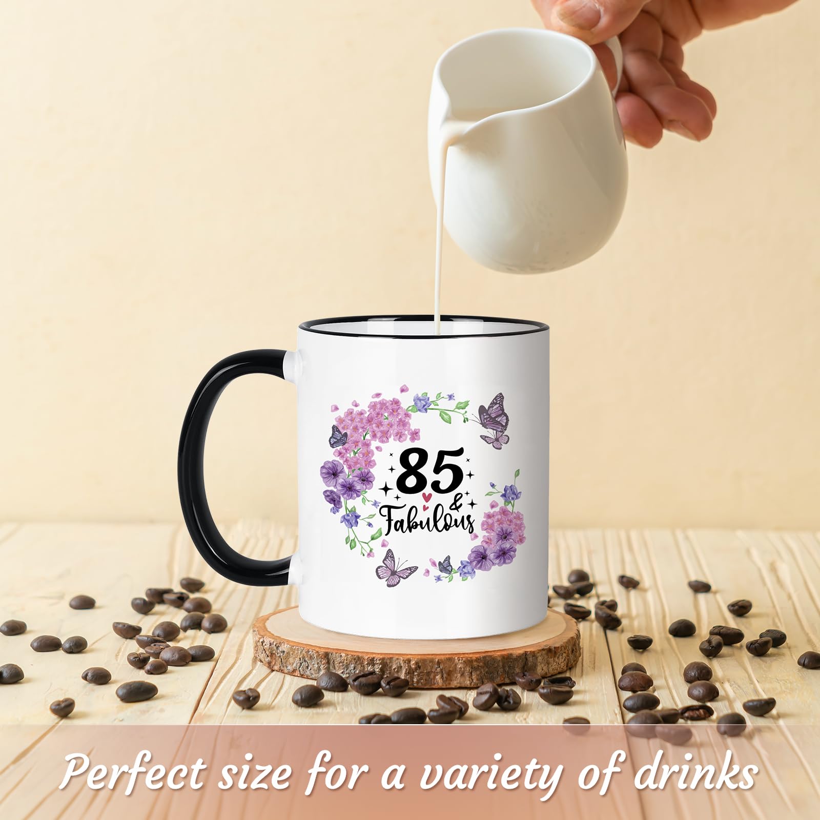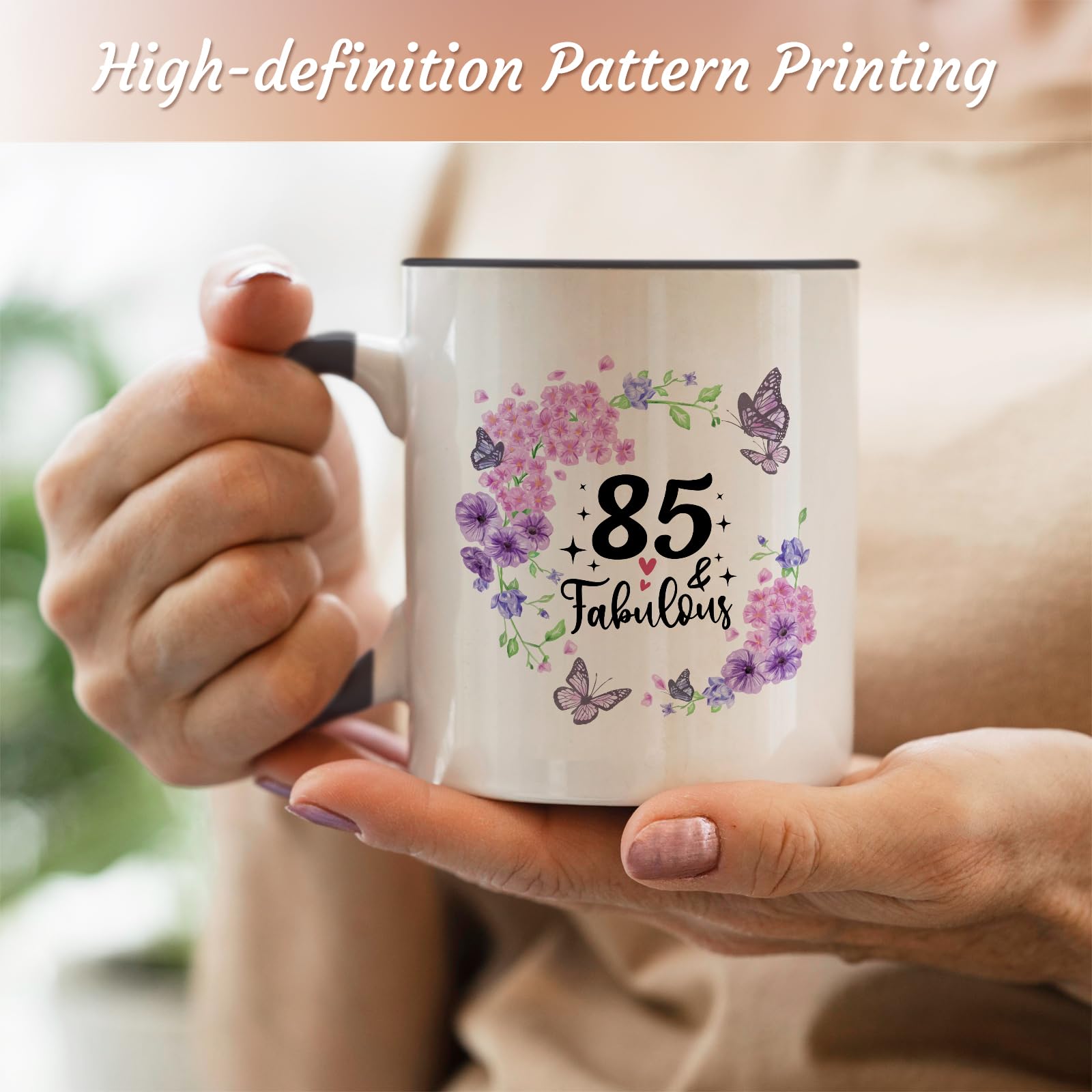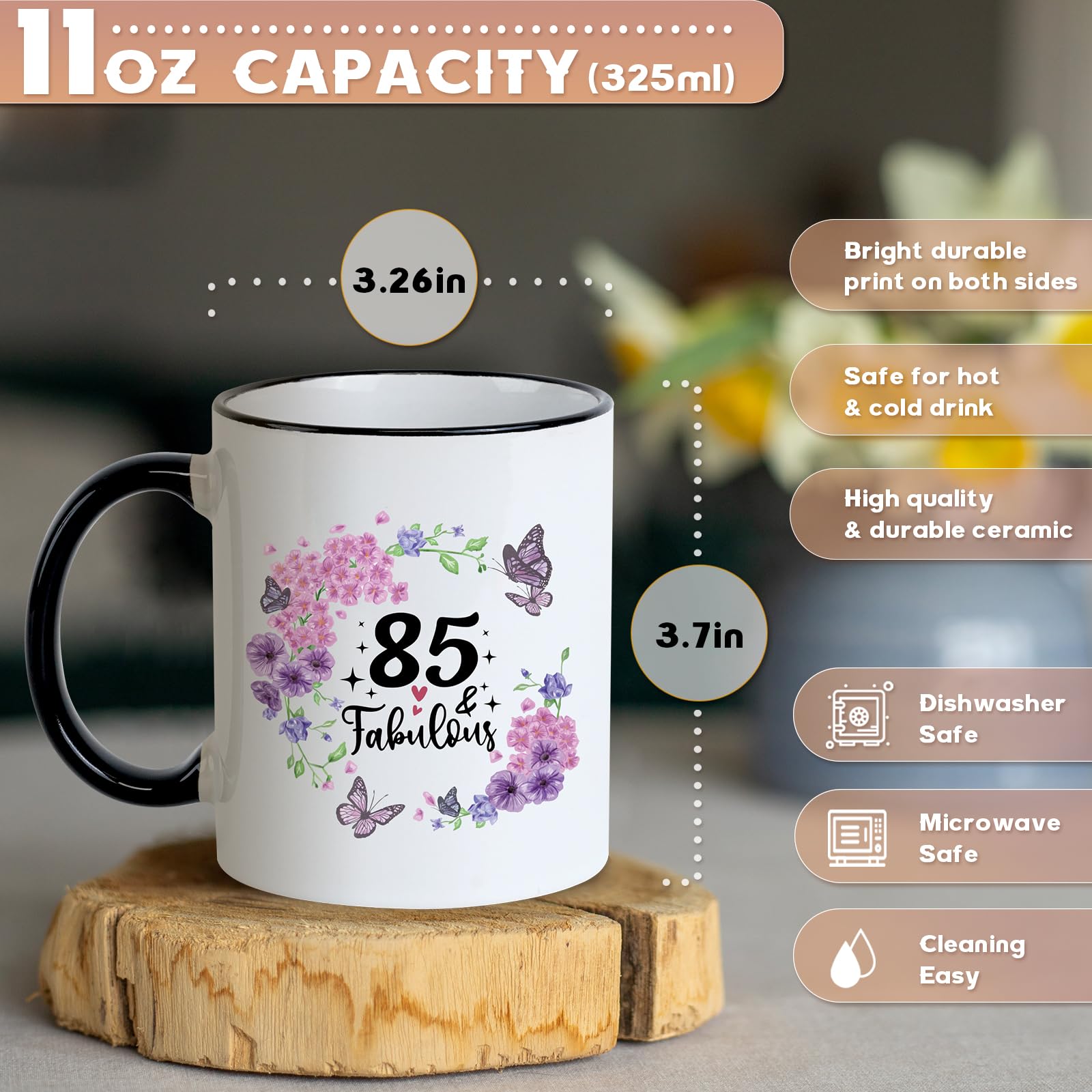 【85 Year Old Birthday Gifts for Women】This mug is specially designed for 85th birthday gifts for women, the text "85 and Fabulous "is surrounded by beautiful flowers, which makes the whole mug look elegant and generous. The same text and pattern is printed on both sides of the mug, give this exquisite and beautiful mug to a beautiful 85 year old woman and she will be very happy when she receives this gift.