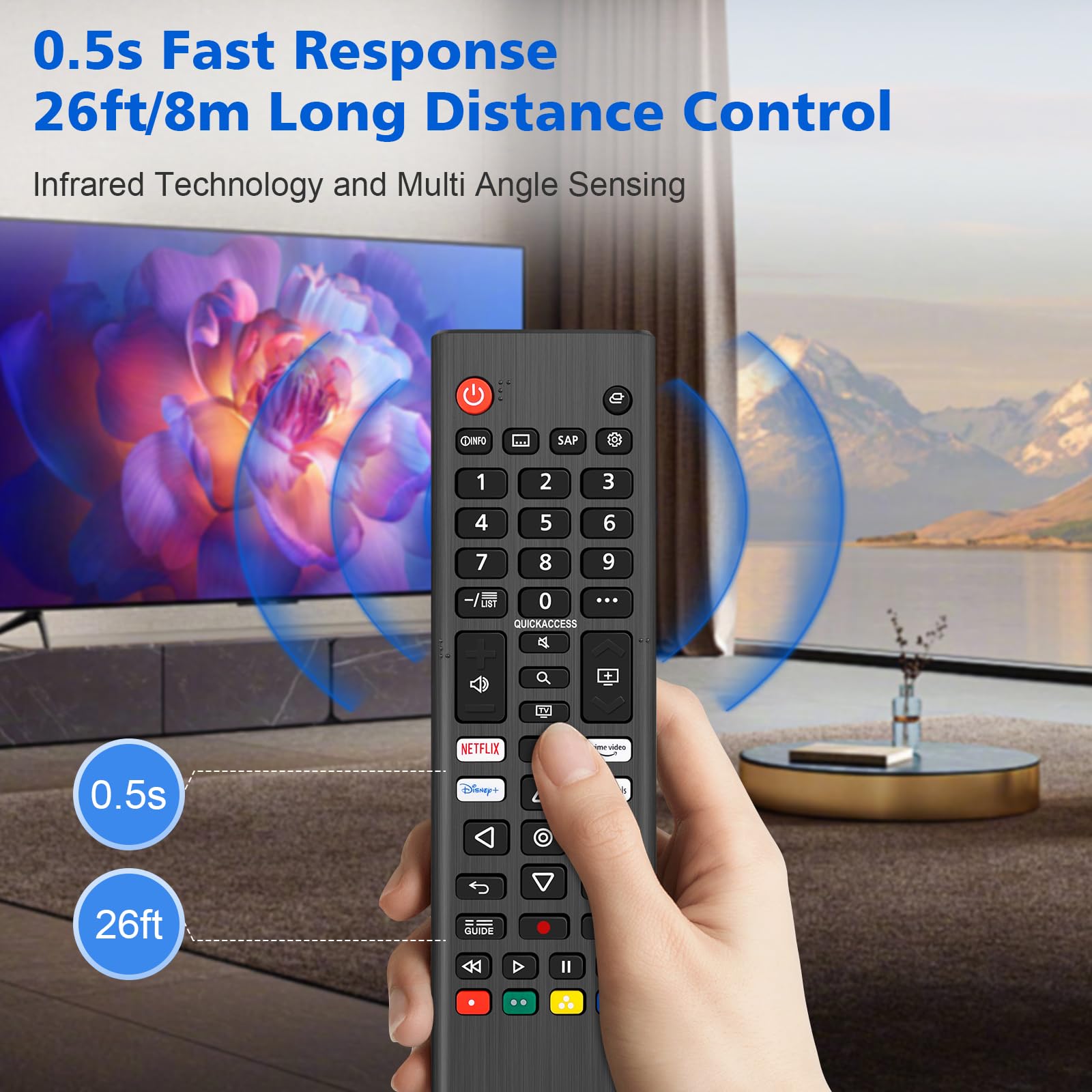 Quick Response Remote for LG Smart TV: Excellent response between TV and remote control, it will quickly respond within 0.5s and achieve over 26ft/8m long distance control. If the button is not responsive, you can try replacing the battery or let us know, and we will provide you with assistance the first time