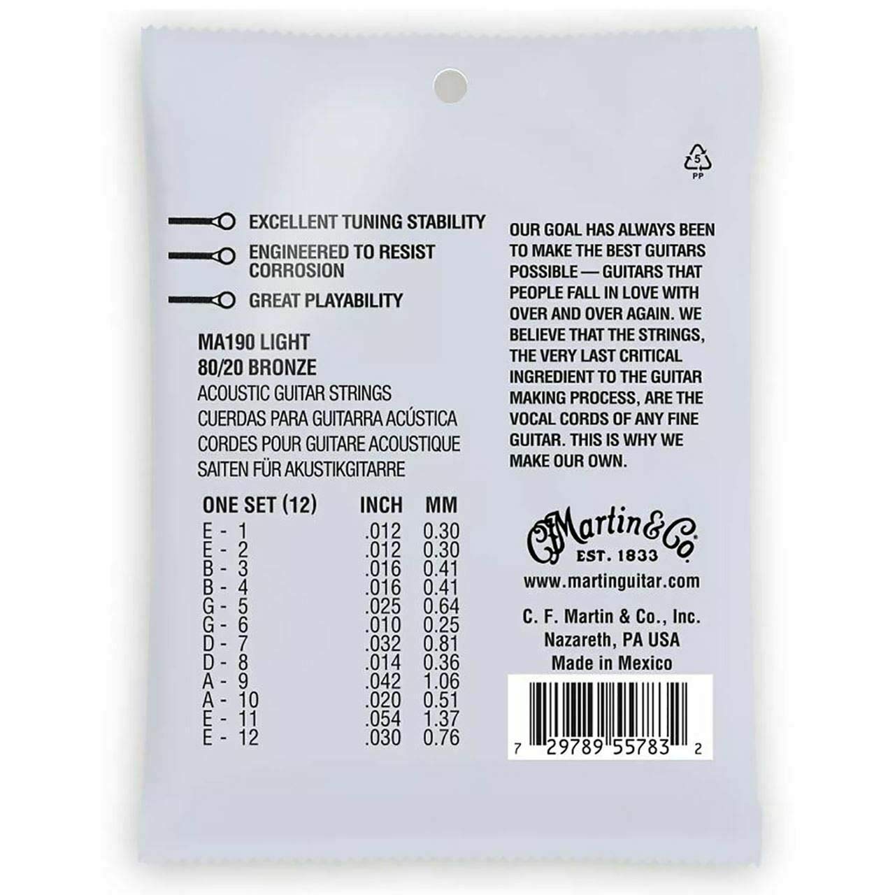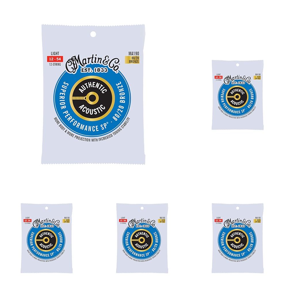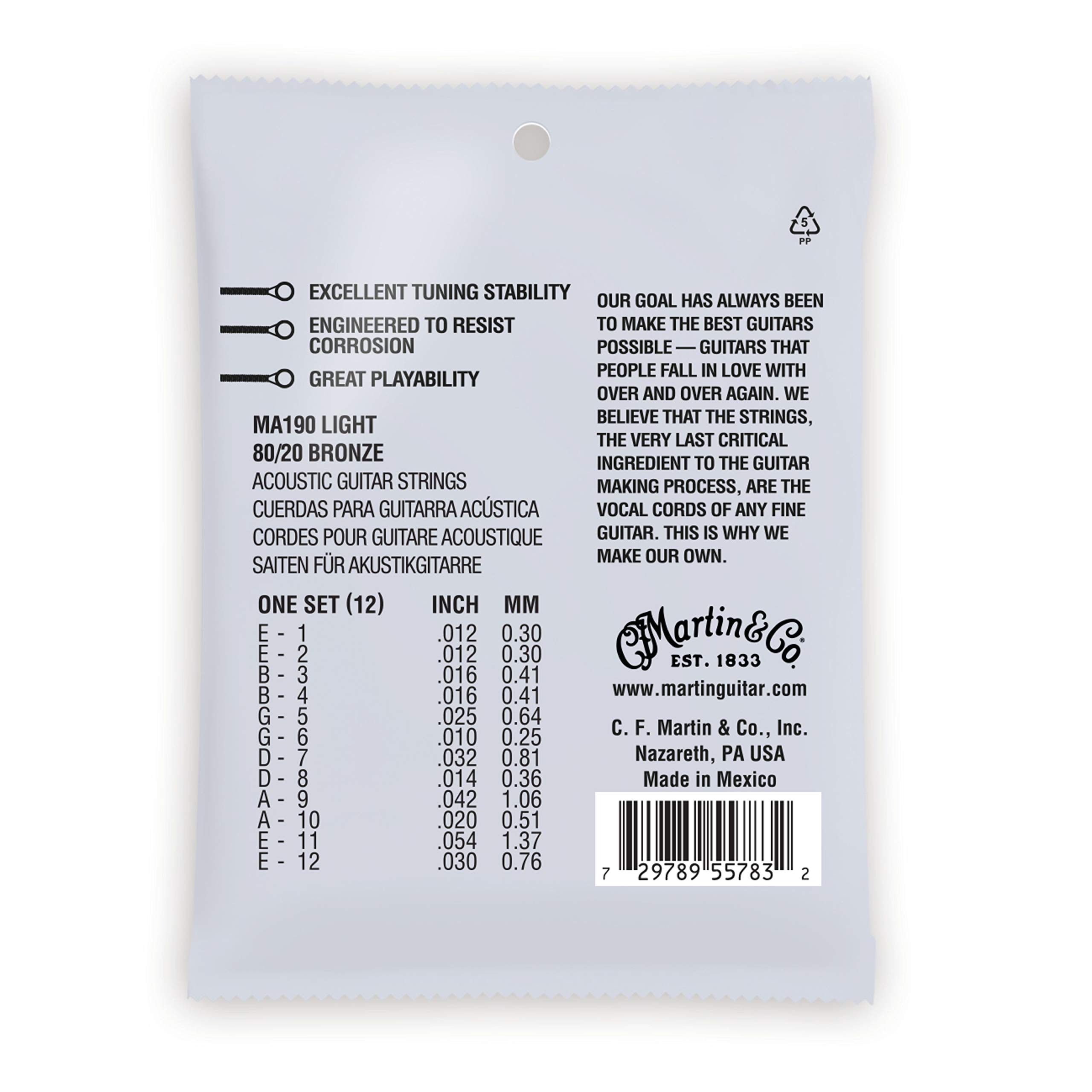 Martin Authentic Acoustic Strings provide unrivaled quality, craftsmanship, and tone for your acoustic guitar. Designed to produce a true, consistent tone, these light-gauge strings provide excellent tuning stability and playability so your guitar can thrive during your rigorous practice and performance schedule. Made from 80/20 bronze, these strings feature Martin's highest-quality wrap wire for enhanced longevity and durability. They are naturally corrosion resistant, so they will hold up after hours and hours of playing. This total pack of professional-grade guitar strings will last through long jam sessions, late-night campfire songs, and plenty of picking. To make these strings extra-durable and stable, we start with our highest-tensile-strength core wire and then tin-plate it on all 12 strings for added corrosion resistance. When the core is coupled with our highest-quality wrap wire, you get a consistent tone that you can count on song after song. Designed to bring out your guitar's true tone, these bronze guitar strings can be used for finger-style blues, rock, Americana, country, bluegrass, ragtime, and many more styles. With this pack, you'll receive 12 light-gauge guitar strings. The low E strings measure 0.054" and 0.030”, the A strings measure 0.042" and 0.020”, the D strings measure 0.032" and 0.014”, the G strings measure 0.025" and 0.010”, the B strings both measure 0.016", and the high E strings both measure 0.012". This total set of light-gauge strings features a tension of 324.0, and they make it easy to get a rich, bright tone out of your guitar. Martin Guitar has been producing high-quality, musician-choice guitars and guitar accessories since 1833. The Martin Authentic Acoustic Light-Gauge Guitar Strings are the real deal—not an imitation. Discover your guitar's true voice with this professional-grade guitar string pack.