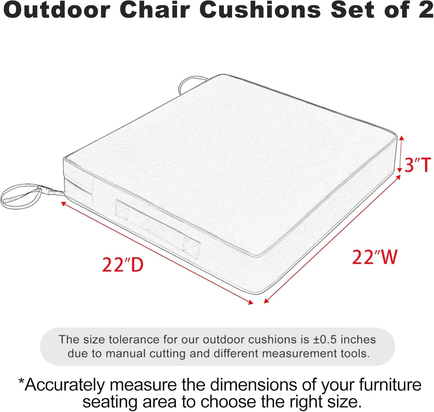 Size Selection - Including 2 outdoor chair cushions measuring 22” W x 22” D x 3” T ( The size description is only for the cushion size, accurately measuring the dimensions of your furniture's seating area before purchasing, make sure the cushion size fits your furniture ). Vacuum-packed cushion needs 48hrs to expand with ±0.5" tolerance from hand-cutting.