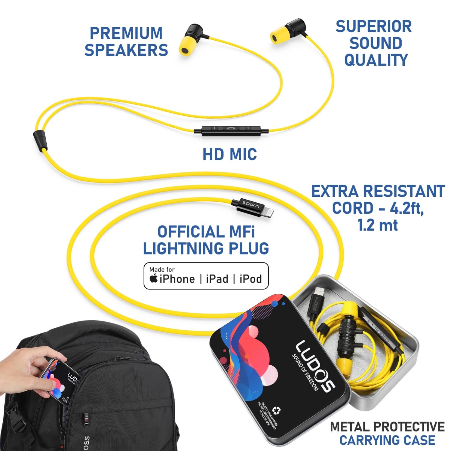 🎵 Strong: These lightning earbuds wired feature rock solid design and a extra long 4.2 ft cord (1.2 mt); iphone 14 headphones wired with mics are designed to be super tough and withstand the most demanding conditions; When you need lightning earbuds for performance, trust only LUDOS