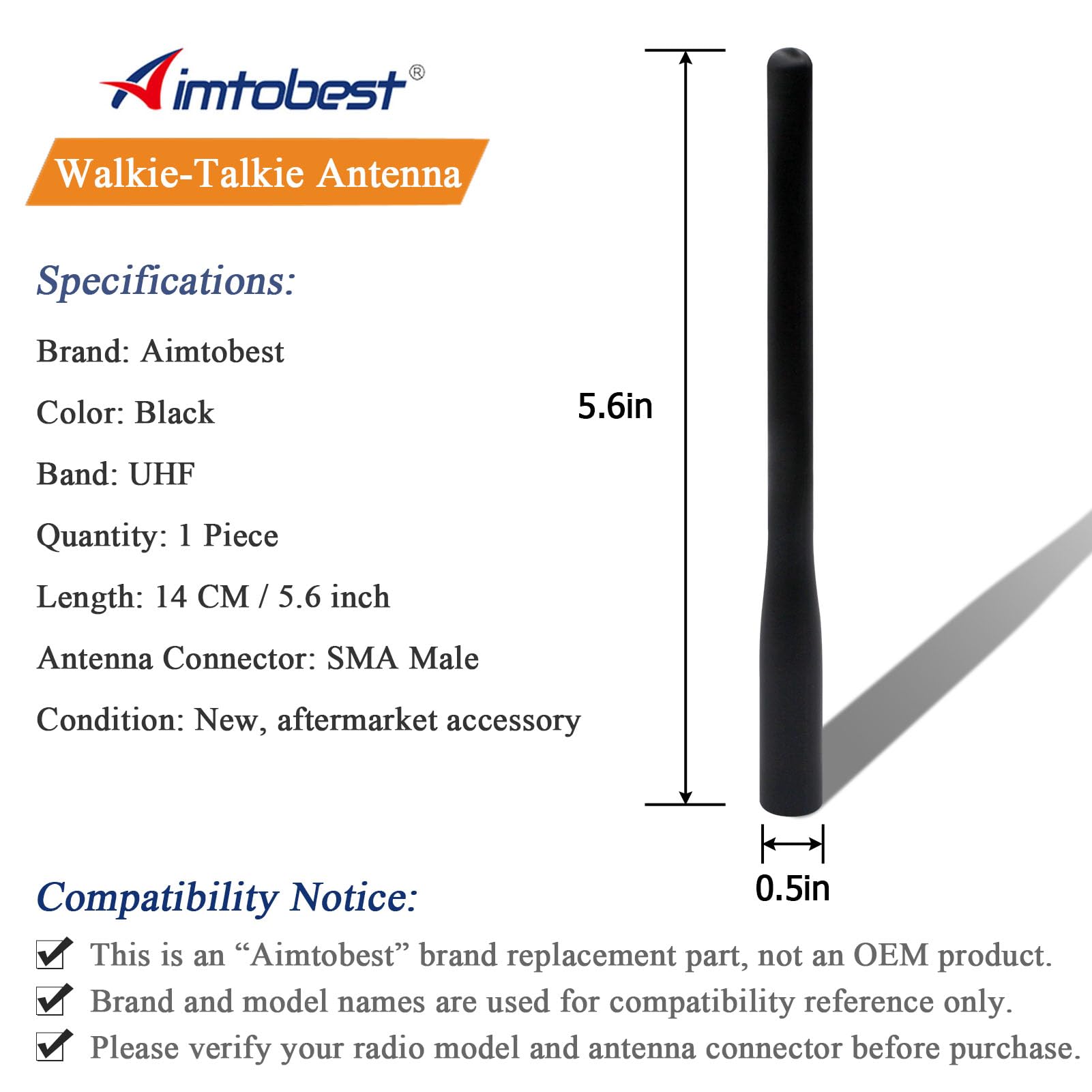 Package Included: 1 x VHF Rubber Duck Antenna Compatible Marine VHF Handheld Radio Models: HX290 HX300 HX380 HX400 HX460 HX751 HX851 HX870 HX890 HX270S HX280S HX370S HX500S HX600S HX750S HX760S HX850S West Marine VHF 250 Except HX470/471 Note: 1. Please kindly note that this is a replacement part with our private brand “Aimtobest” and not an original equipment manufacturer (OEM) product. Our products themselves and packaging do not have any logos or brand names. 2. The mention of brand name or specific model No descriptions is solely intended to illustrate compatibility. 3. All brand names and logos mentioned are registered trademarks of their respective owners. 4. If you need more details, please feel free to contact us. Thanks!