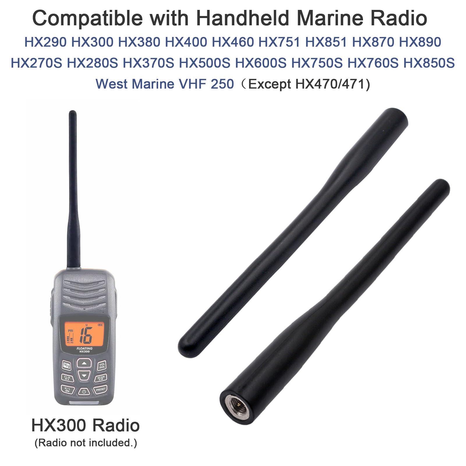 Compatibility: Directly compatible with HX270S, HX280S, HX290, HX300, HX370S, HX400, HX460, HX500, HX850S, HX851, HX870, HX890, West Marine VHF 250, and other SMA male handheld marine VHF radios. (Not compatible with HX470/471 models.)