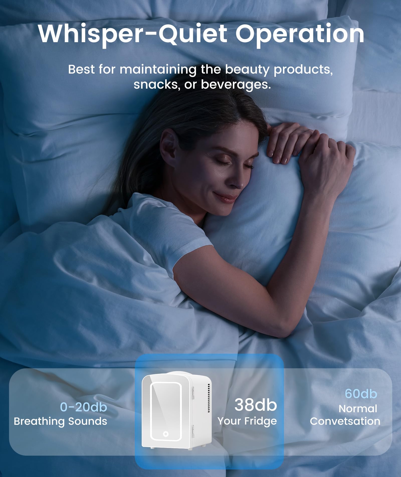 【Eco-friendly & Safe】The fridge’s semiconductor refrigeration chip is freon-free and pass the ETL test, so you can rest easy-- even with the fridge right next to you. It is great for bedrooms, offices, dorms, travel, car, camping and ideal gift for friends.